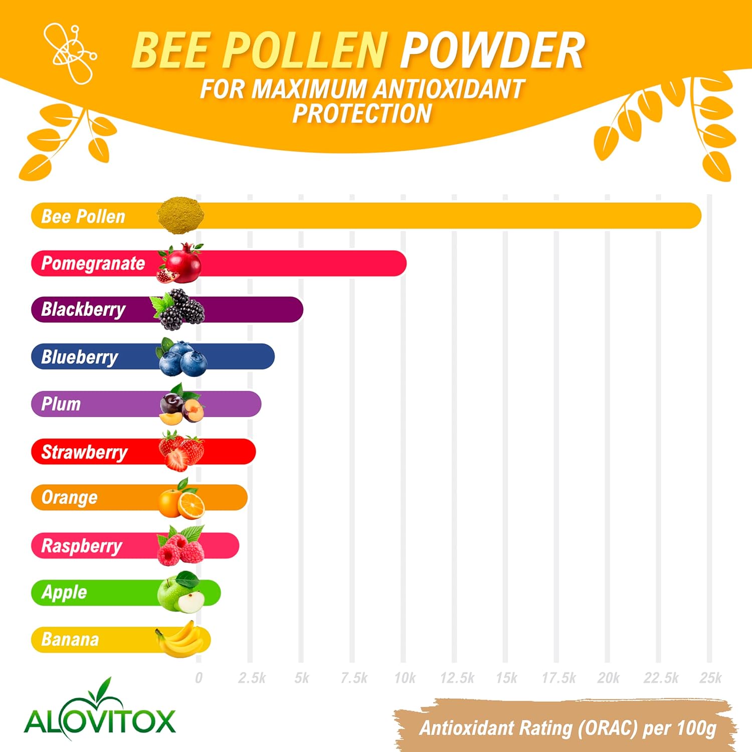 About this item NATURE’S MULTI-VITAMIN: Alovitox Bee Pollen Powder are gluten free & nutrient-dense powered -packed superfood. Our Organically Raw Bee Pollen has the same nutrients that a table full of vegetables, fruits, meats & even herbs have! Our Protein Superfood contains significant vitamins, A, B2, B6, C, D & E, proteins, lipids, fatty acids, minerals, Carbohydrates, & antioxidants! WORK AS NATURAL SUPERFOOD: Our high-quality bee pollen is nearly 22% protein, with more protein per ounce than any other natural food. Our Nutritional Yeast is naturally energizing & supports muscle recovery, making a great addition to pre & post work out shakes & smoothies. Our beekeepers are able to extract pollen from hives without causing any harm to bee community. BEE POLLEN BENEFIT: Our Immune Support has one of the highest concentrations of absorbable antioxidants in any food. Our Bee Pollen Powder works to Supports your immune system by reducing oxidative stress & protecting your cells from damage caused by free radicals. Our Bee Pollen Extract has immune-boosting properties such as flavonoids, leukotrienes, catechins & phenolic acids (kaempferol, quercetin, and isorhamnetin) PACKED WITH ESSENTIAL FATTY ACIDS: Our Bee Pollen Superfood is packed with essential fatty acids, such as linoleic & -linoleic. Our Raw Bee Pollen Powder also has the acids pantothenic, nicotinic, folic, biotin, rutin & inositol. Believe it or not, even calcium has been found in bee pollen. A great addition to boost your everyday diet! EASY TO ADD TO YOUR DIET: Our Friendly Bee Pollen is 100% pure, fresh & natural with a pleasantly sweet & floral flavour. Sprinkle a spoonful over your favourite shakes, smoothies, breakfast bowls, yoghurt, oatmeal & even salads for a tasty & nutritional boost! ALLERGEN WARNING: Persons allergic to bees should not consume bee pollen as it may trigger an allergic reaction. Always consult a doctor before trying bee pollen especially if you have known allergies. Alovitox products are manufactured in a facility that also handles tree nuts. Our organic Cacao Morning Contains purple corn.  See more product details,NATURE’S MULTI-VITAMIN: Alovitox Bee Pollen Powder are gluten free & nutrient-dense powered -packed superfood. Our Organically Raw Bee Pollen has the same nutrients that a table full of vegetables, fruits, meats & even herbs have! Our Protein Superfood contains significant vitamins, A, B2, B6, C, D & E, proteins, lipids, fatty acids, minerals, Carbohydrates, & antioxidants!,WORK AS NATURAL SUPERFOOD: Our high-quality bee pollen is nearly 22% protein, with more protein per ounce than any other natural food. Our Nutritional Yeast is naturally energizing & supports muscle recovery, making a great addition to pre & post work out shakes & smoothies. Our beekeepers are able to extract pollen from hives without causing any harm to bee community,BEE POLLEN BENEFIT: Our Immune Support has one of the highest concentrations of absorbable antioxidants in any food. Our Bee Pollen Powder works to Supports your immune system by reducing oxidative stress & protecting your cells from damage caused by free radicals. Our Bee Pollen Extract has immune-boosting properties such as flavonoids, leukotrienes, catechins & phenolic acids (kaempferol, quercetin, and isorhamnetin),PACKED WITH ESSENTIAL FATTY ACIDS: Our Bee Pollen Superfood is packed with essential fatty acids, such as linoleic & -linoleic. Our Raw Bee Pollen Powder also has the acids pantothenic, nicotinic, folic, biotin, rutin & inositol. Believe it or not, even calcium has been found in bee pollen. A great addition to boost your everyday diet!,EASY TO ADD TO YOUR DIET: Our Friendly Bee Pollen is 100% pure, fresh & natural with a pleasantly sweet & floral flavour. Sprinkle a spoonful over your favourite shakes, smoothies, breakfast bowls, yoghurt, oatmeal & even salads for a tasty & nutritional boost!,ALLERGEN WARNING: Persons allergic to bees should not consume bee pollen as it may trigger an allergic reaction. Always consult a doctor before trying bee pollen especially if you have known allergies. Alovitox products are manufactured in a facility that also handles tree nuts. Our organic Cacao Morning Contains purple corn