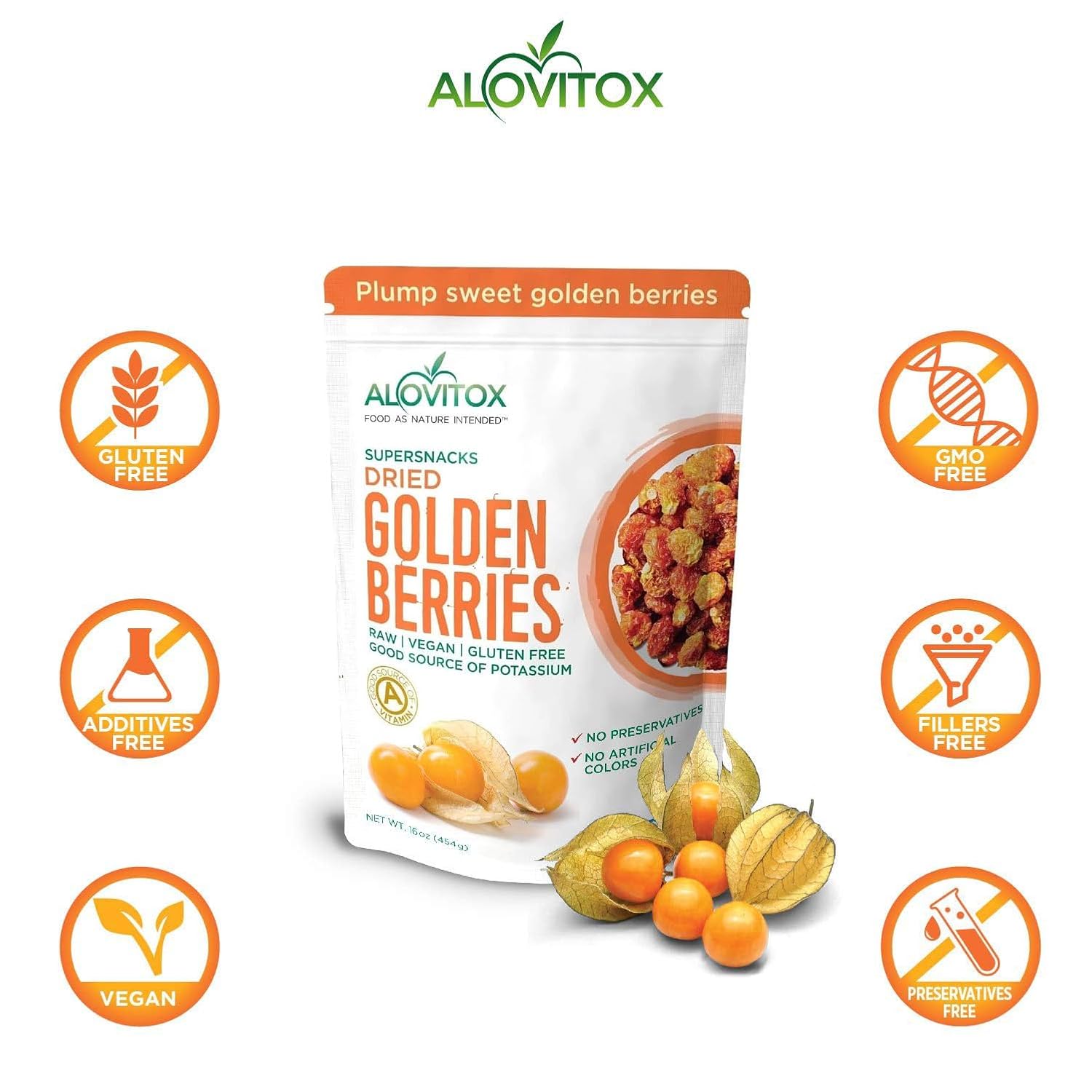 Alovitox Sun Dried Golden Berries | Raw, Fresh & Organic | 1 Oz Contains 2G Protein & 5G Fiber, Low-Calorie & Glycemic Index | With Potassium, Iron, Vitamins A & C | Gluten-Free, Vegan | 8 Oz
