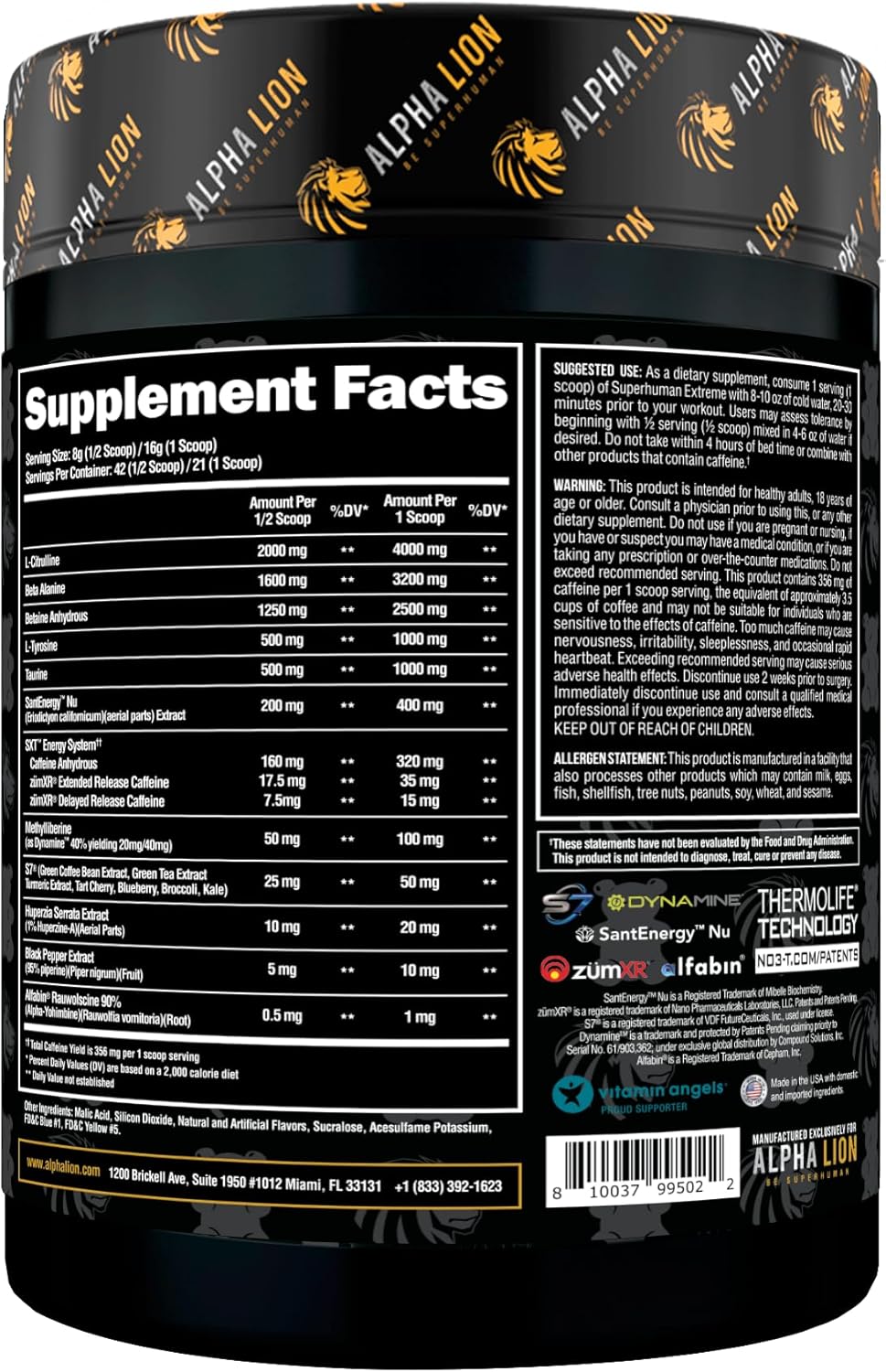 About this item HOW IT COMPARES: Superhuman Extreme is a high-intensity, amplified stimulant version of the original, high-performance pre workout powder from Alpha Lion. This supplement takes the original Superhuman Preworkout and ramps it up a notch, so you can take your workouts to the next level. PREMIUM INGREDIENTS: These supplements for men and women are crafted with researched backed ingredients. Pre workout capsule is made with 5 trademarked ingredients that are banned substance free and GRAS (Generally Regarded as Safe). Workout container includes a 100% transparent label GREAT TASTING CAFFEINE MATRIX: Our Superhuman Extreme Workout Supplement provides increased total caffeine content powered by our all new SXT Sustained Energy and Focus System. This tri-source caffeine matrix will provide you with more sustained energy and focus vs the standard forms of caffeine used in other dietary supplements. Our Hulk Juice Supplement will be like enjoying a delicious, top-shelf cocktail drink from a professional mixologist vs taking nasty shots of clearance bin vodka. INCREASE ENDURANCE: Performance inspired pre workout can help enhance nitric oxide generation, increasing blood flow and fueling muscle energy and endurance. That means better pumps and longer lasting energy during your workout. STACK IT: These energy supplements are designed to be a comprehensive pre-workout solution. You can stack this perfectly with our other Alpha Lion products such as Superhuman Intra, Superhuman Protein, any of our Gains Candy products, or if you want to amplify your pumps to the next level, stack with our Superhuman Pump. See more product details,HOW IT COMPARES: Superhuman Extreme is a high-intensity, amplified stimulant version of the original, high-performance pre workout powder from Alpha Lion. This supplement takes the original Superhuman Preworkout and ramps it up a notch, so you can take your workouts to the next level,PREMIUM INGREDIENTS: These supplements for men and women are crafted with researched backed ingredients. Pre workout capsule is made with 5 trademarked ingredients that are banned substance free and GRAS (Generally Regarded as Safe). Workout container includes a 100% transparent label,GREAT TASTING CAFFEINE MATRIX: Our Superhuman Extreme Workout Supplement provides increased total caffeine content powered by our all new SXT Sustained Energy and Focus System. This tri-source caffeine matrix will provide you with more sustained energy and focus vs the standard forms of caffeine used in other dietary supplements. Our Hulk Juice Supplement will be like enjoying a delicious, top-shelf cocktail drink from a professional mixologist vs taking nasty shots of clearance bin vodka,INCREASE ENDURANCE: Performance inspired pre workout can help enhance nitric oxide generation, increasing blood flow and fueling muscle energy and endurance. That means better pumps and longer lasting energy during your workout,STACK IT: These energy supplements are designed to be a comprehensive pre-workout solution. You can stack this perfectly with our other Alpha Lion products such as Superhuman Intra, Superhuman Protein, any of our Gains Candy products, or if you want to amplify your pumps to the next level, stack with our Superhuman Pump