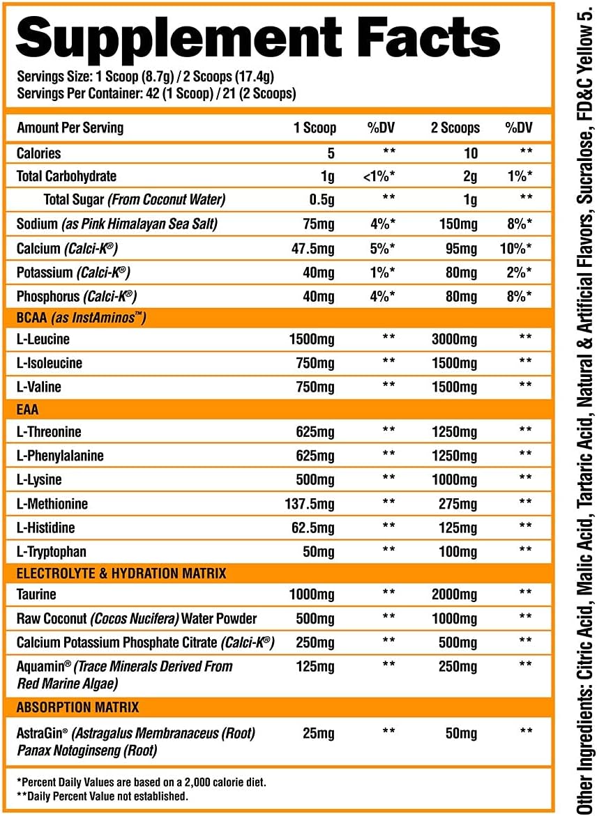 Package Dimensions : 12.9 Ounce Item Form Powder Item Weight 0.43 Kilograms Product Benefits Supports Recovery Process, Helps Reduce Muscular Fatigue, Promotes Healthy Hydration Number of Items 1 Servings per Container 42 UPC 810037991994