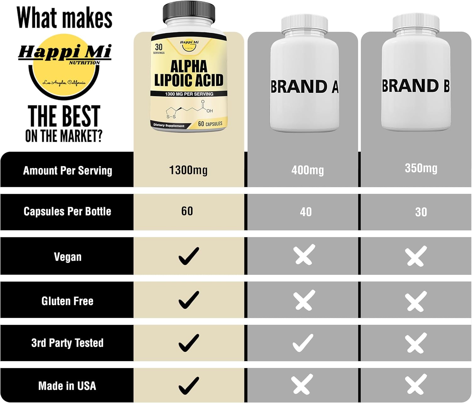 Happi Mi Nutritionās Alpha Lipoic Acid capsule contains nothing but Alpha Lipoic Acid. Our bottle comes in 60 vegetarian capsules for 30 days supply