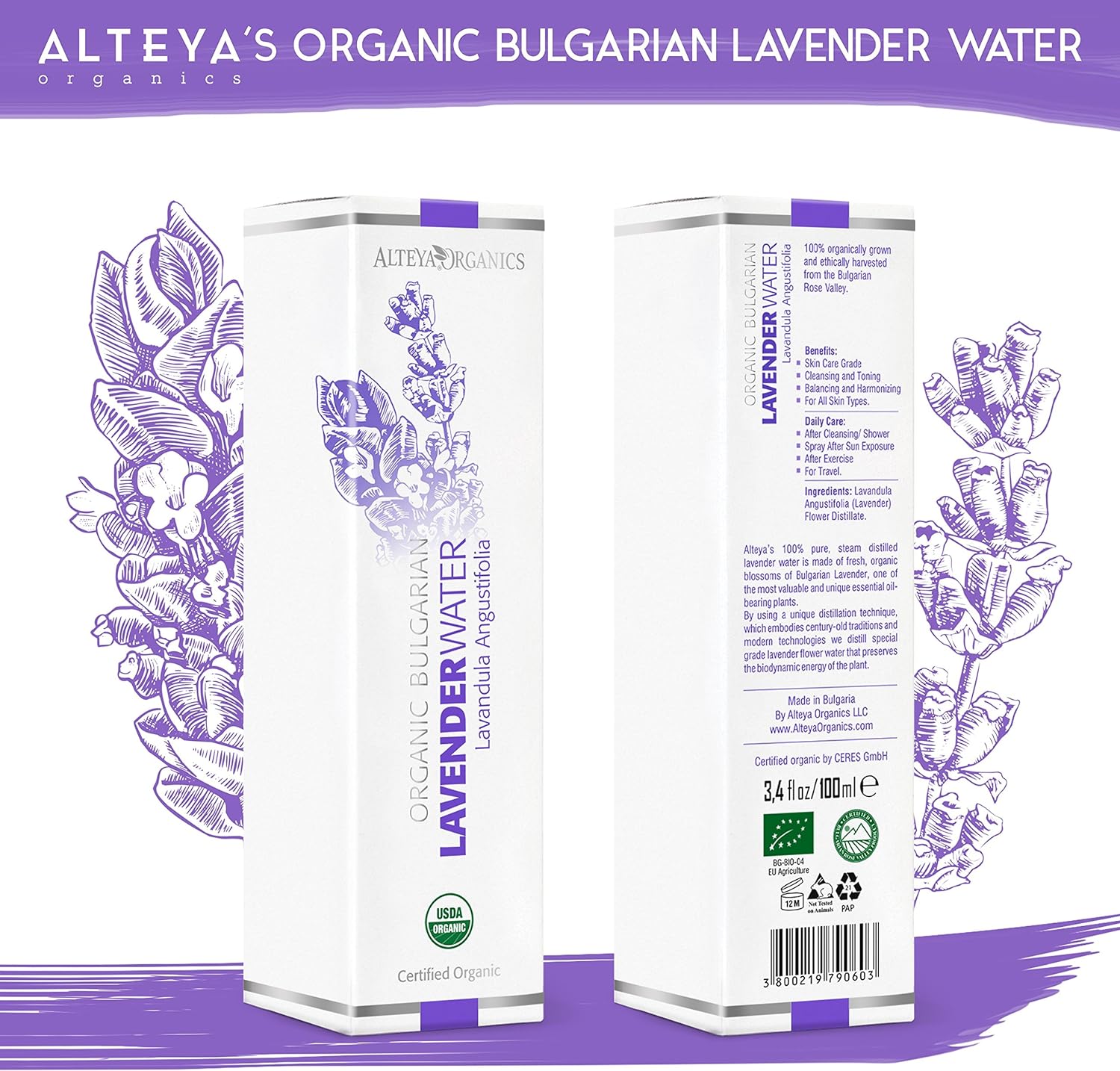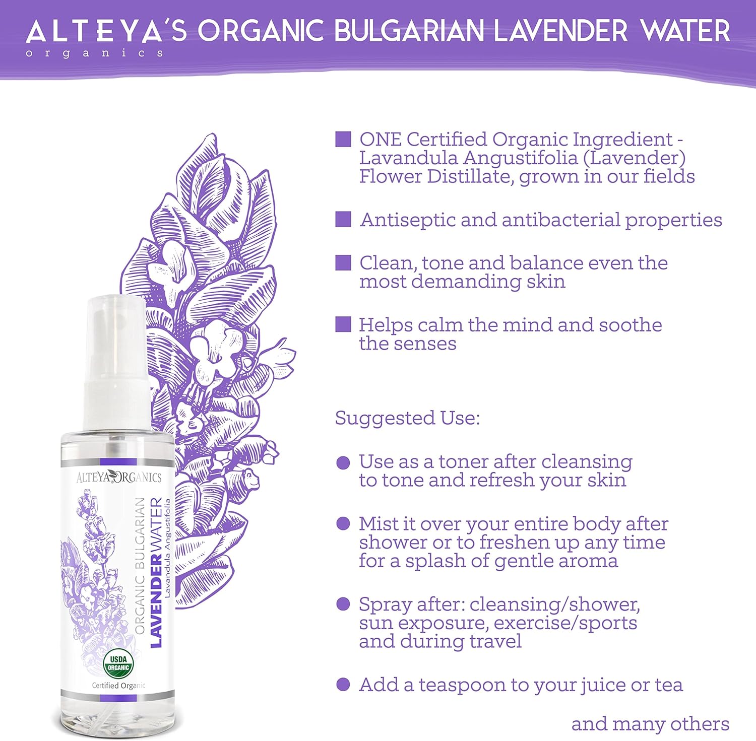 USDA certified organic, 100% VEGAN. Made by Alteya Organics Anti-aging and moisturizing Calming, relaxing, and harmonizingAlteya Organics Lavender Water USDA Certified Organic Facial Toner, 3.4 Fl Oz/100mL Pure Bulgarian Lavandula Angustifolia Flower Water, Award-Winning Moisturizer BPA-Free Spray Bottle