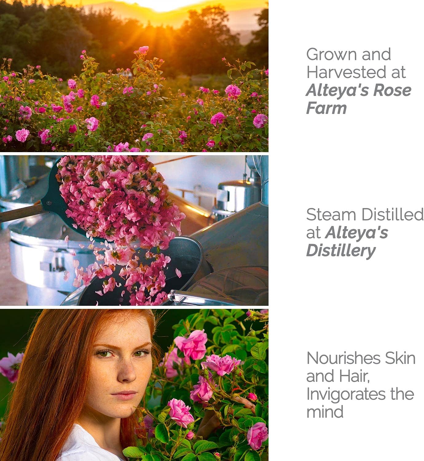 PRIMARY STEAM-DISTILLED BY ALTEYA: Distilled directly from fresh Rosa Damascena Bulgaria petals, and via Alteya's proprietary methodology that combines traditions with science to capture the most complete range of aromatic plants’ benefits, with rich composition of essential oil micro-elements and full concentration of hydrophilic components. As a result, our organic rose water has multiple skin benefits and applications in beauty and wellbeing