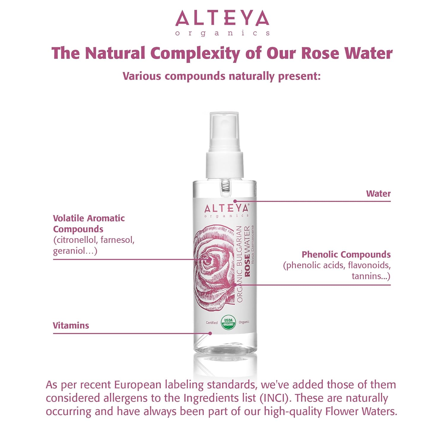 About this item USDA CERTIFIED ORGANIC: Certified according to the USDA NOP Program, the strictest organic standard in the world. Always check to ensure a product carries the USDA Organic logo. NON-GMO. PRIMARY STEAM-DISTILLED BY ALTEYA: Distilled directly from fresh Rosa Damascena Bulgaria petals, and via Alteya's proprietary methodology that combines traditions with science to capture the most complete range of aromatic plants’ benefits, with rich composition of essential oil micro-elements and full concentration of hydrophilic components. As a result, our organic rose water has multiple skin benefits and applications in beauty and wellbeing. CLEAN EFFECTIVE SKINCARE: Suitable for ALL skin types. May benefit skin by supporting skin rejuvenation and renewal. Also known to help soften, tone and hydrate skin by providing essential micronutrients and maintaining proper skin’s pH balance. May also help calm skin and relieve redness. AWARD-WINNING: Also featured in People Magazine, ELLE, In-Style, Delicious Living, Organic Spa, New York Fashion Week, and many others. FROM ALTEYA'S ROSES AND ALTEYA's DISTILLERY: Just one ingredient, 100% Pure Steam-Distilled Certified Organic "Alteya" Rosa Damascena Skin-grade Distillate. Straight from the heart of the Bulgarian Rose Valley. Alteya's rose water does not have the strong artificial aroma of rose perfumes or of the other rose varieties domesticated roses sold at florist shops (they are different rose types with no skin care properties). It is not water mixed with essential oils or created in a lab. FULL TRACEABILITY: Boasts the most full and complete traceability in the world - crafted in our own distillery from our own organic rose gardens utilizing our own source of healing underground spring water See more product details,USDA CERTIFIED ORGANIC: Certified according to the USDA NOP Program, the strictest organic standard in the world. Always check to ensure a product carries the USDA Organic logo. NON-GMO,PRIMARY STEAM-DISTILLED BY ALTEYA: Distilled directly from fresh Rosa Damascena Bulgaria petals, and via Alteya's proprietary methodology that combines traditions with science to capture the most complete range of aromatic plants’ benefits, with rich composition of essential oil micro-elements and full concentration of hydrophilic components. As a result, our organic rose water has multiple skin benefits and applications in beauty and wellbeing,CLEAN EFFECTIVE SKINCARE: Suitable for ALL skin types. May benefit skin by supporting skin rejuvenation and renewal. Also known to help soften, tone and hydrate skin by providing essential micronutrients and maintaining proper skin’s pH balance. May also help calm skin and relieve redness,AWARD-WINNING: Also featured in People Magazine, ELLE, In-Style, Delicious Living, Organic Spa, New York Fashion Week, and many others,FROM ALTEYA'S ROSES AND ALTEYA's DISTILLERY: Just one ingredient, 100% Pure Steam-Distilled Certified Organic "Alteya" Rosa Damascena Skin-grade Distillate. Straight from the heart of the Bulgarian Rose Valley. Alteya's rose water does not have the strong artificial aroma of rose perfumes or of the other rose varieties domesticated roses sold at florist shops (they are different rose types with no skin care properties). It is not water mixed with essential oils or created in a lab,FULL TRACEABILITY: Boasts the most full and complete traceability in the world - crafted in our own distillery from our own organic rose gardens utilizing our own source of healing underground spring water