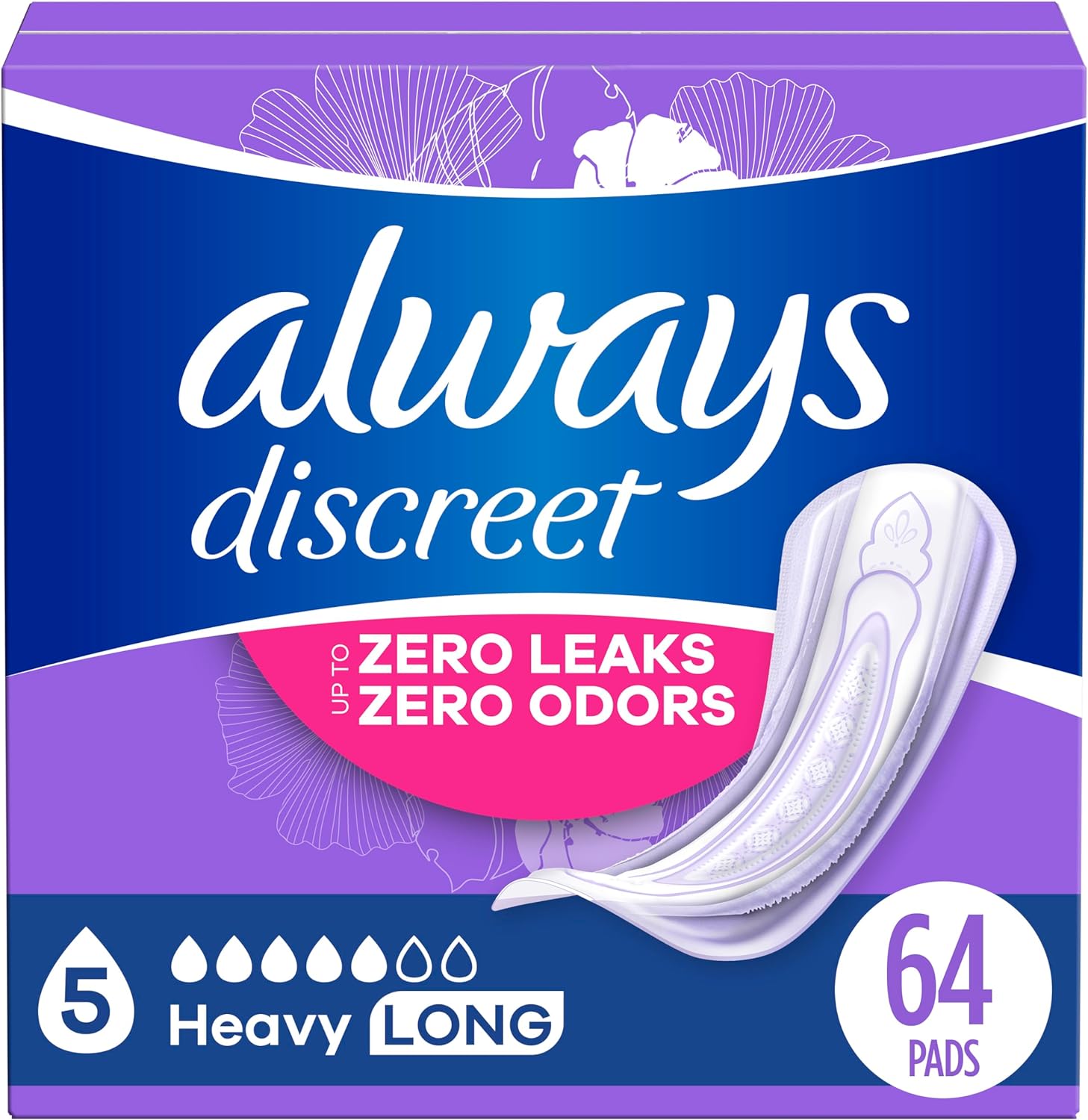 Always Discreet Adult Incontinence Pads For Women, Heavy Absorbency, Long Length, Postpartum Pads, 64 Ct