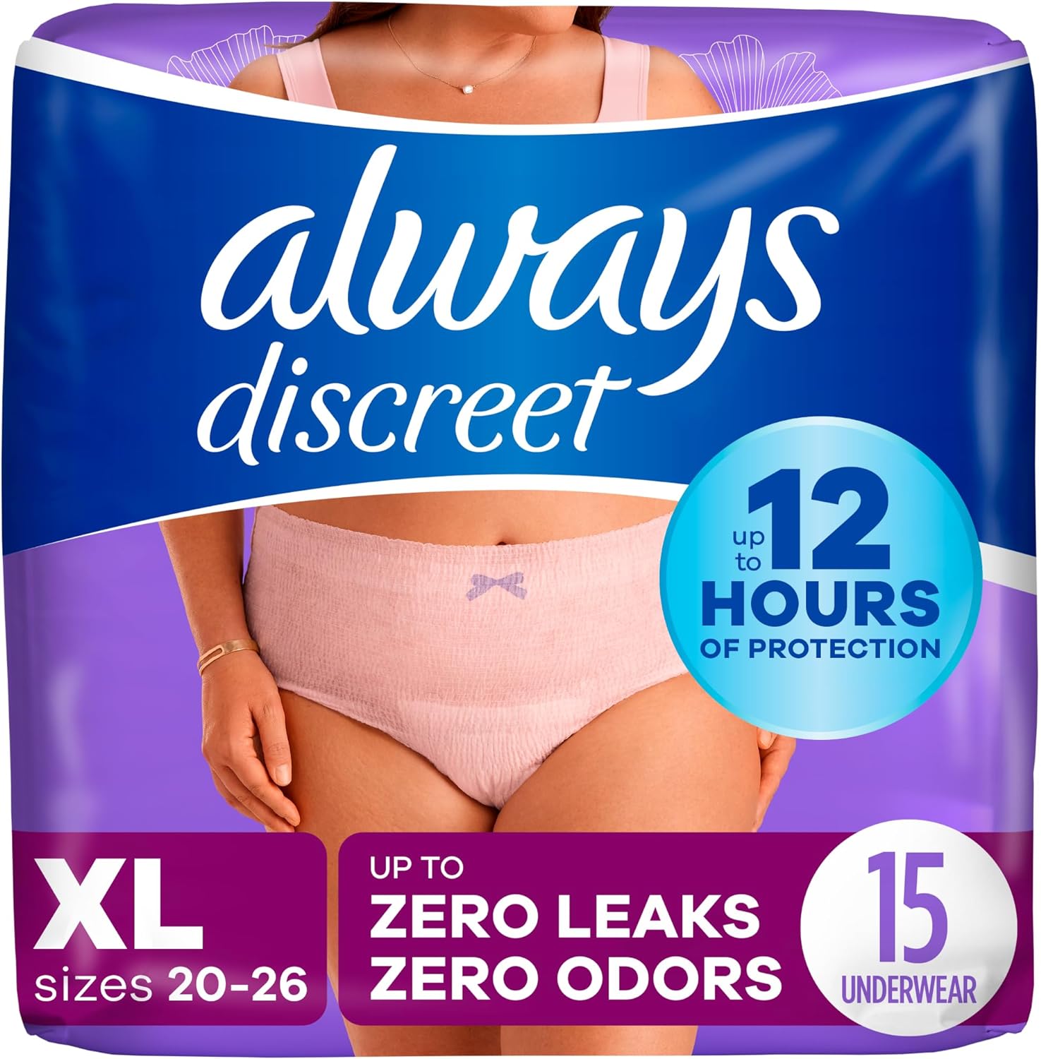 Finally, Long-Lasting Bladder Leak Protection That Feels As Good As It Looks. Say 'Never Again' To Bulky Adult Diapers And 'Hello' To Always Discreet Disposable Incontinence Underwear For Women With A Smooth And Secure Fit That Looks And Feels Like Real Underwear. The Form-Fitting Design Of Always Discreet Incontinence And Postpartum Underwear For Women Hugs Your Curves With A Soft, Silk-Like Fabric So You Can Walk With Poise And Confidence. It'S The Delicate, Barely Noticeable Look You Want In Disposable Panties For Women, Paired With The Leak-Proof Protection You Deserve. The Super Absorbent Core Turns Liquid To Gel To Stop Bladder Leaks In Seconds For Up To 12 Hours Of Reliable Leak-Free Protection. Exclusive Odorlock Technology Neutralizes Odors Instantly And Continuously, To Help You Feel Confidently Fresh And Dry All Day Long. Unexpected Leaks Don'T Stand A Chance With The Special Side Leakguard Design That Helps Stop Bladder Leaks At The Leg, Where They Happen Most. Get Incredible Protection With The Disposable Underwear Women Can Depend On. Specially Designed To Fit All Kinds Of Curves, Always Discreet Incontinence Underwear Is Available In Sizes Small / Medium - Large / Extra Large/ Xxl, So You'Ll Be Sure To Get The Protection You Deserve With Always Discreet Incontinence And Postpartum Underwear. Easy Open Bags For Extra Convenience. Incontinence Panties For Women Ship Discreetly And Are Available In Bulk. Fsa And Hsa Eligible