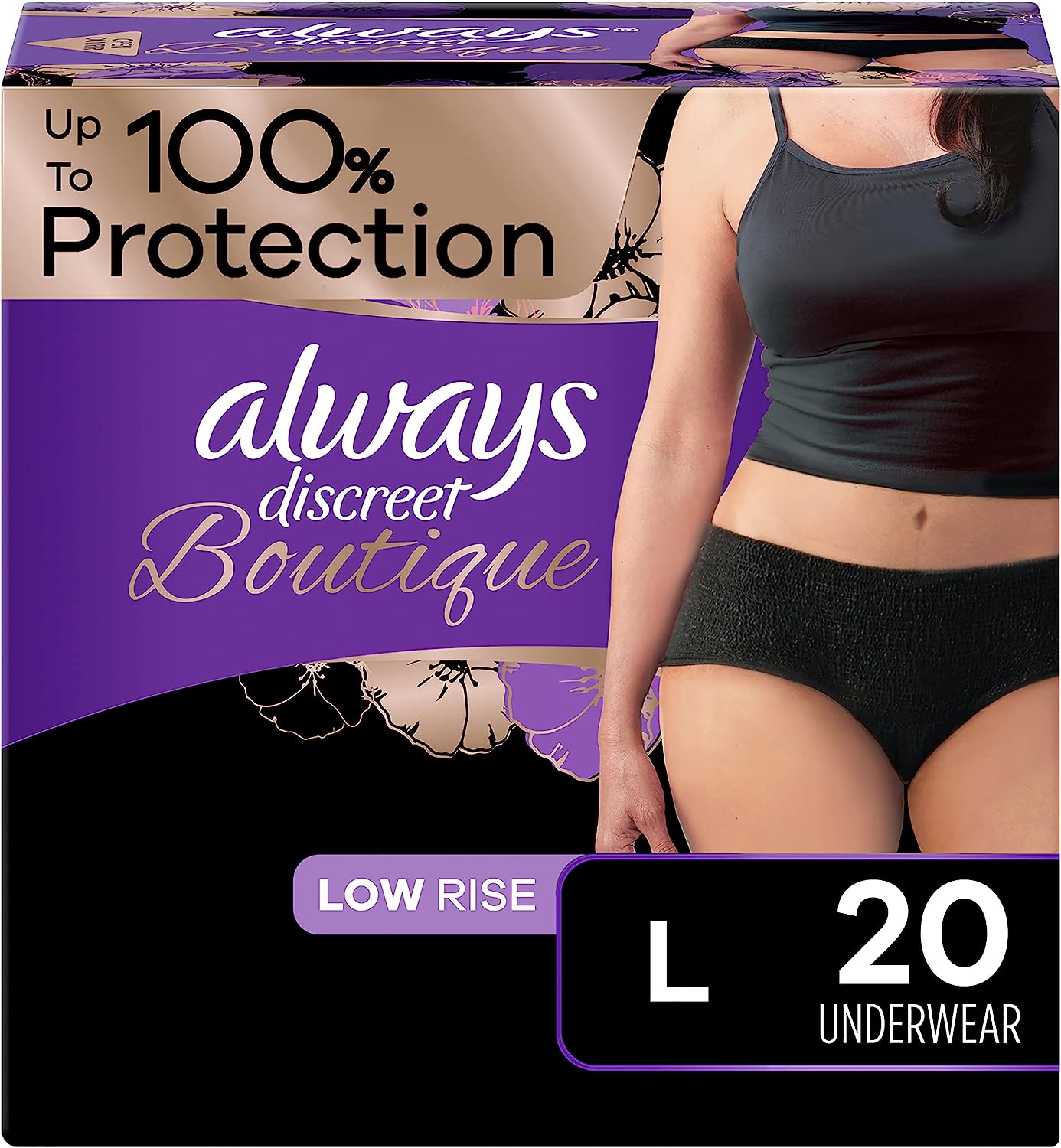 Always Discreet Boutique Adult Incontinence & Postpartum Underwear For Women, Low-Rise, Size Large, Black, Maximum Absorbency, Disposable, 20 Count