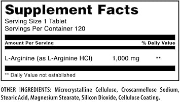 About this item L-Arginine 1000mg Per Serving Supplement 120 Servings Per Bottle, 1 Tablet Per Serving Non-GMO, Gluten Free, Third Party Tested Manufactured in accordance with GMP Standards Proudly made in the USA with Guaranteed Purity & Potency See more product details,L-Arginine 1000mg Per Serving Supplement,120 Servings Per Bottle, 1 Tablet Per Serving,Non-GMO, Gluten Free, Third Party Tested,Manufactured in accordance with GMP Standards,Proudly made in the USA with Guaranteed Purity & Potency
