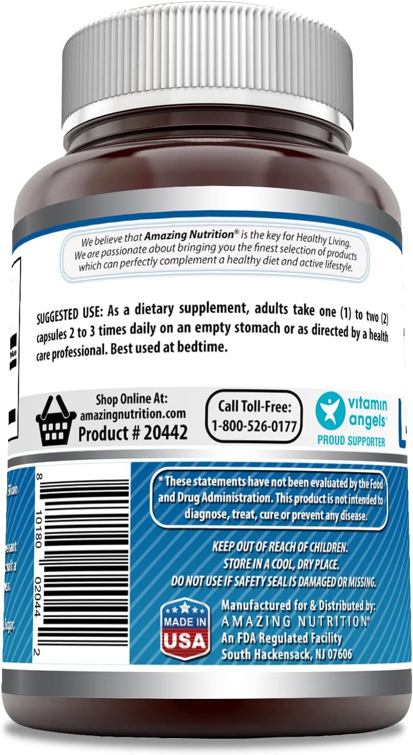 About this item THE NATURAL WAY TO GET A GOOD NIGHT'S SLEEP Amazing Nutrition L-tryptophan capsules supply your body with an amino acid needed to regulate sleep and is free of added herbs and drugs, making it a safe natural sleep supplement NOT JUST A SLEEP SUPPLEMENT L-Trytophan also supports positive mood, healthy immune system function, healthy circulation and helps to alleviates stress THE PERFECT DOSE Our L-tryptophan 500 mg capsules give you the amount of the amino acid most frequently recommended by health care professionals for l tryptophan supplementation All Amazing Formulas products are manufactured in accordance with Good Manufacturing Practices (GMP), among the highest standards in the world. All our products are proudly made in USA with Guaranteed Purity & Potency. We offer best quality products for the best value. All our products are Third Party Tested. We do not compromise on quality See more product details,THE NATURAL WAY TO GET A GOOD NIGHT'S SLEEP Amazing Nutrition L-tryptophan capsules supply your body with an amino acid needed to regulate sleep and is free of added herbs and drugs, making it a safe natural sleep supplement,NOT JUST A SLEEP SUPPLEMENT L-Trytophan also supports positive mood, healthy immune system function, healthy circulation and helps to alleviates stress,THE PERFECT DOSE Our L-tryptophan 500 mg capsules give you the amount of the amino acid most frequently recommended by health care professionals for l tryptophan supplementation,All Amazing Formulas products are manufactured in accordance with Good Manufacturing Practices (GMP), among the highest standards in the world,All our products are proudly made in USA with Guaranteed Purity & Potency. We offer best quality products for the best value. All our products are Third Party Tested. We do not compromise on quality