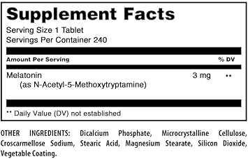 About this item Melatonin 3 Mg Per Serving Supplement 1 Tablets Per Serving, 240 Servings Per Bottle Non-GMO, Gluten Free, Third Party Tested Manufactured in accordance with GMP Standards Proudly made in the USA with Guaranteed Purity & Potency See more product details,Melatonin 3 Mg Per Serving Supplement,1 Tablets Per Serving, 240 Servings Per Bottle,Non-GMO, Gluten Free, Third Party Tested,Manufactured in accordance with GMP Standards,Proudly made in the USA with Guaranteed Purity & Potency