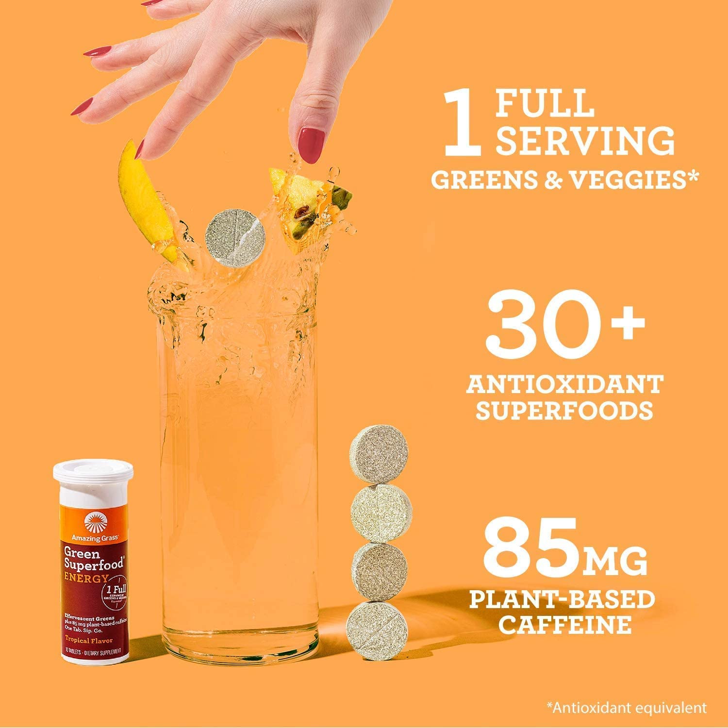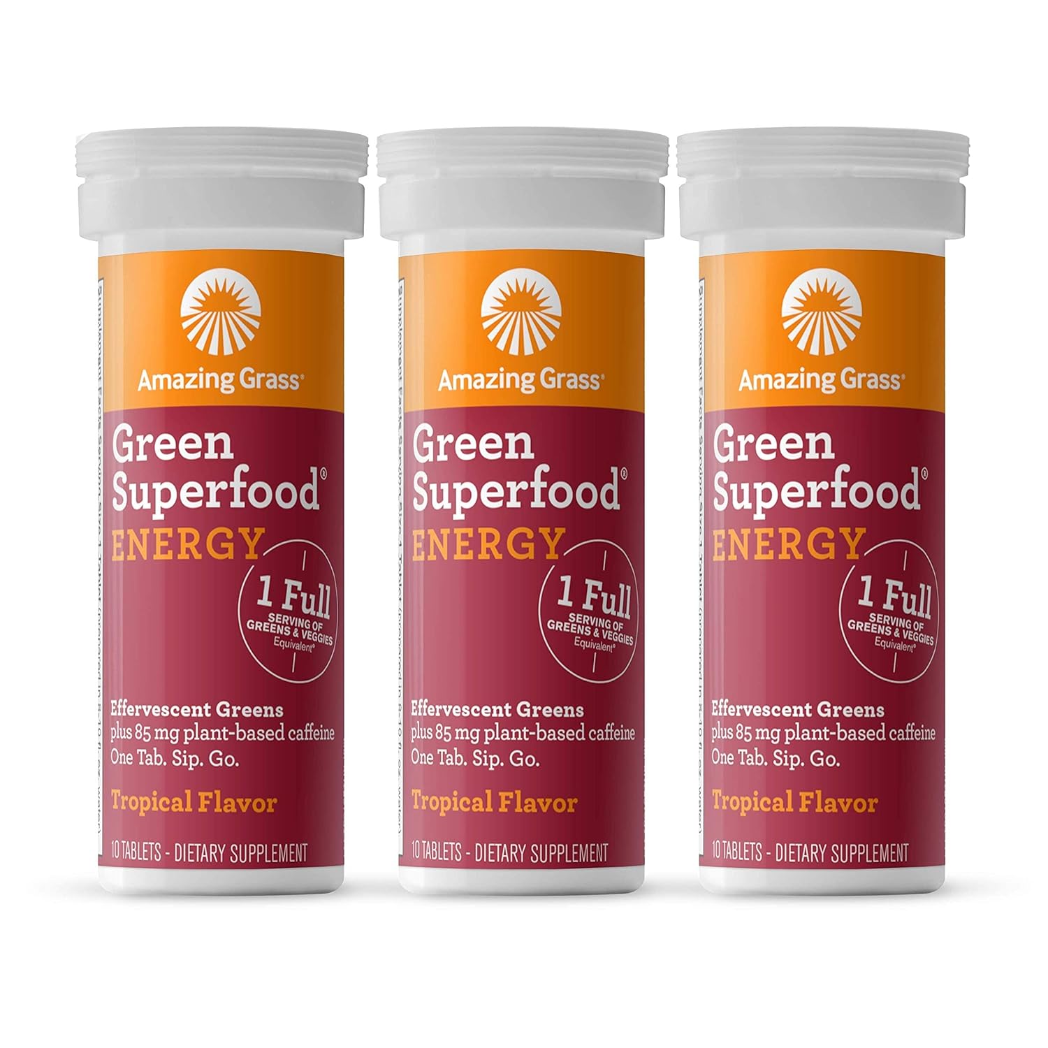 Amazing Grass Effervescent Energy Tablets: Greens + Green Tea Caffeine, Water Flavoring Tablet With Antioxidants, Nootropics Support, Tropical, 10 Count (Pack Of 3)