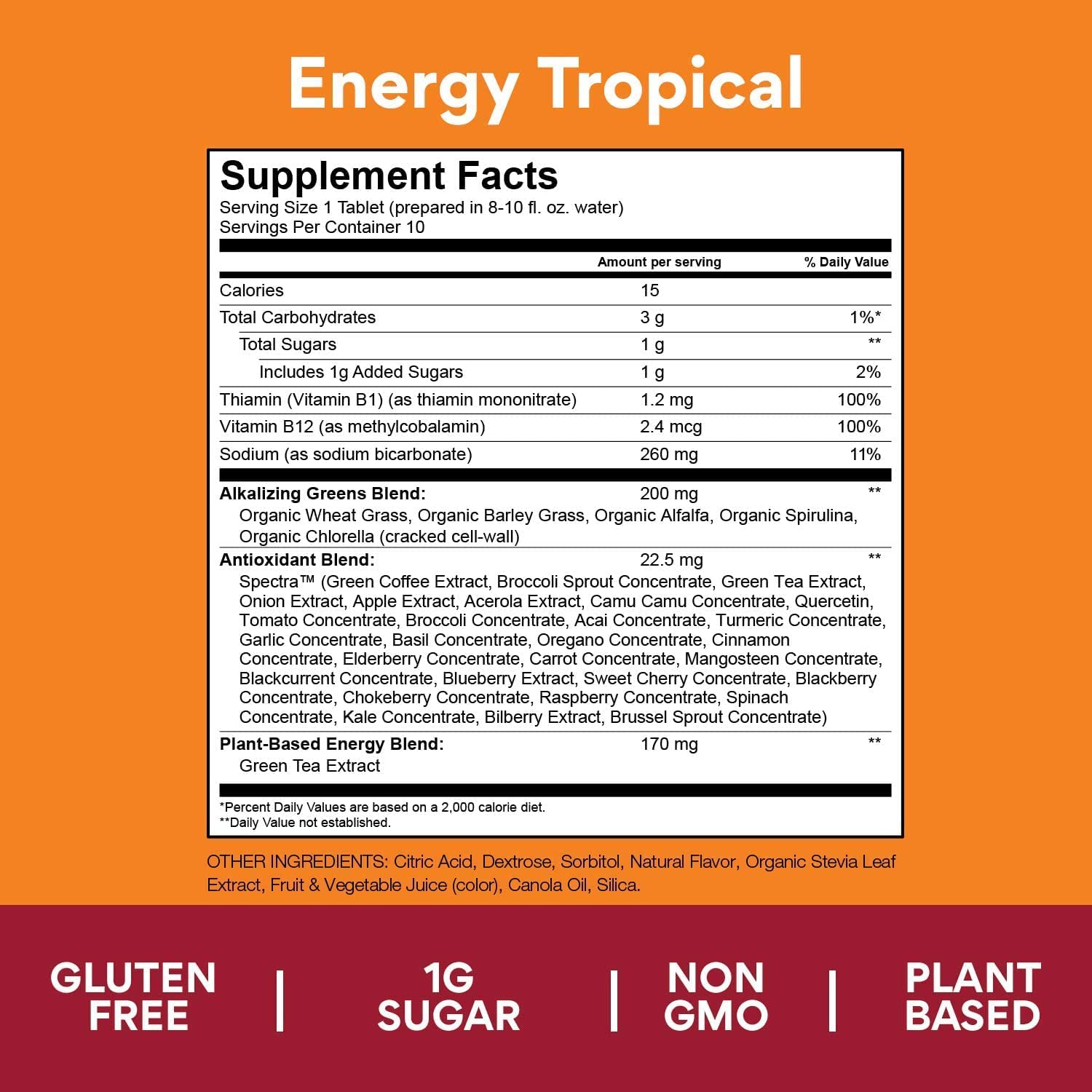 Our Green Superfood Effervescent Energy Tropical blend thoughtfully combines our alkalizing farm fresh greens and over 30 antioxidant superfoods plus 85mg plant-based caffeine, from green tea extract, in a convenient effervescent tablet. Drop one tab into 8-10 fl oz of water for a refreshing way to feel amazing every day