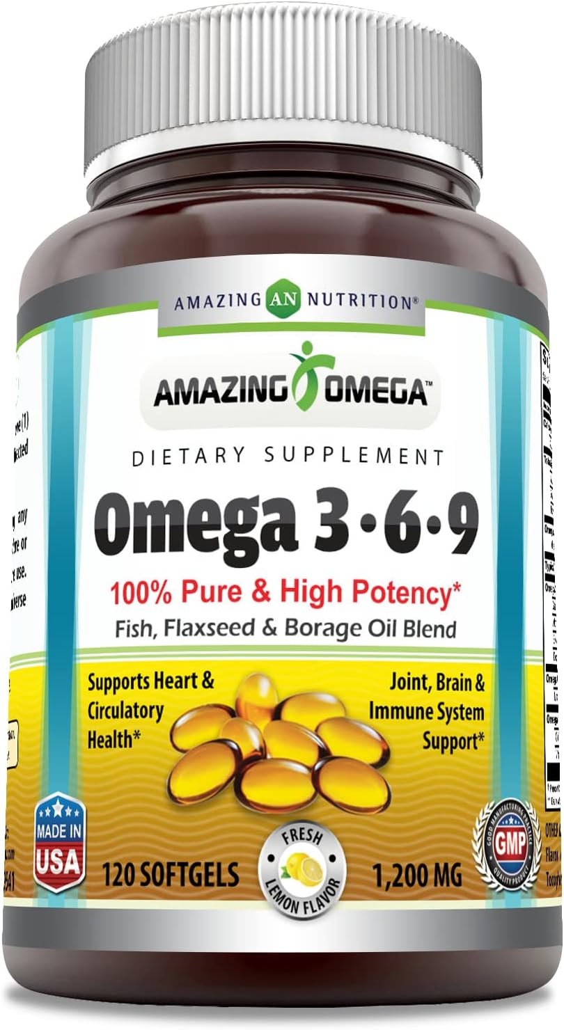 Amazing Omega 3.6.9 1200 mg, Softgels * Unique Formula Combining Flaxseed Oil 400 mg, Fish Oil 400 mg and Borage Oil 400 mg * Rich in Omega-3, 6 and 9 Fatty Acids * (120 Count) (Lemon Flavor)