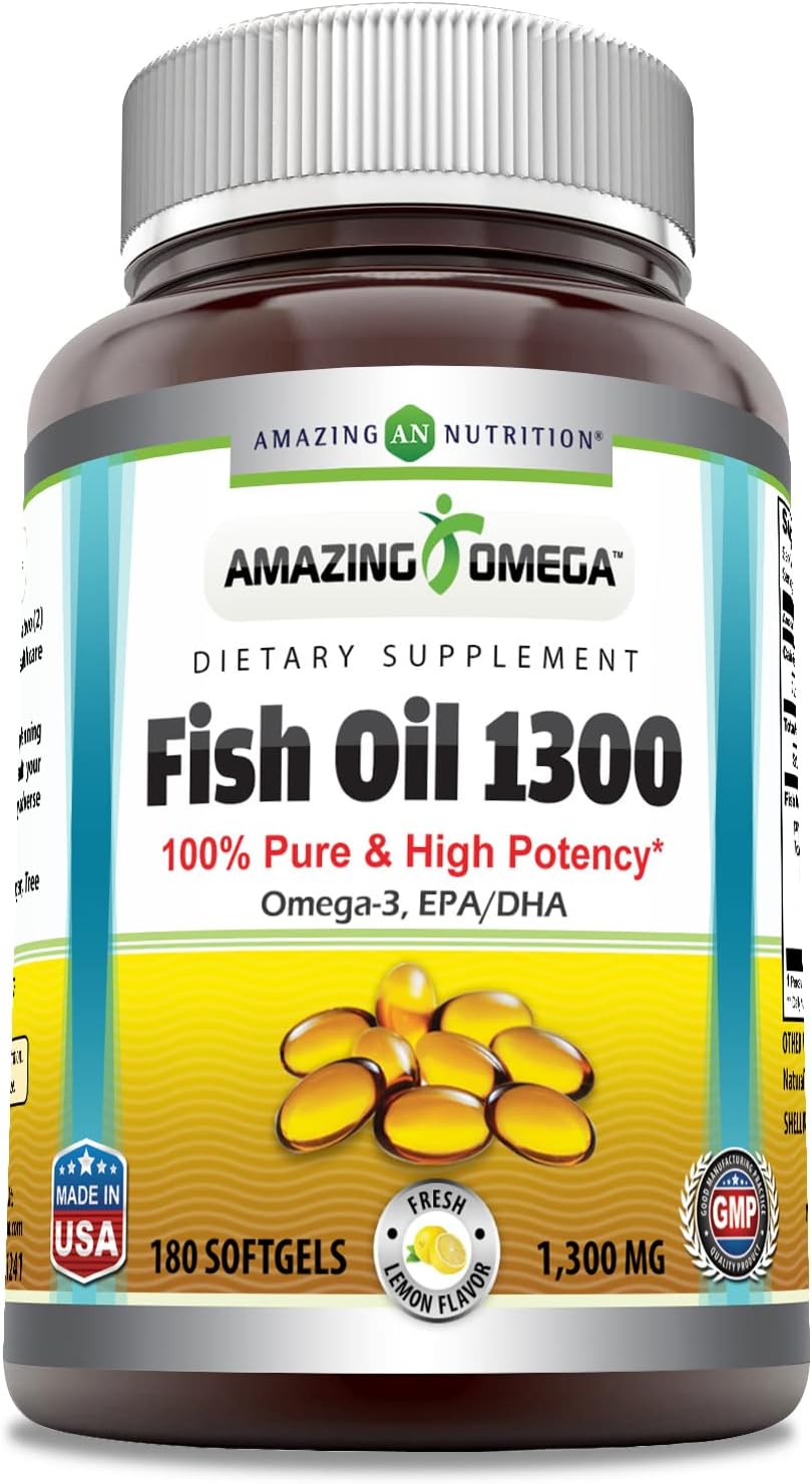 Amazing Omega Fish Oil (Omega-3) 1300mg 180 Softgels Supplement | Lemon Flavor | Non-GMO | Gluten Free | Made in USA