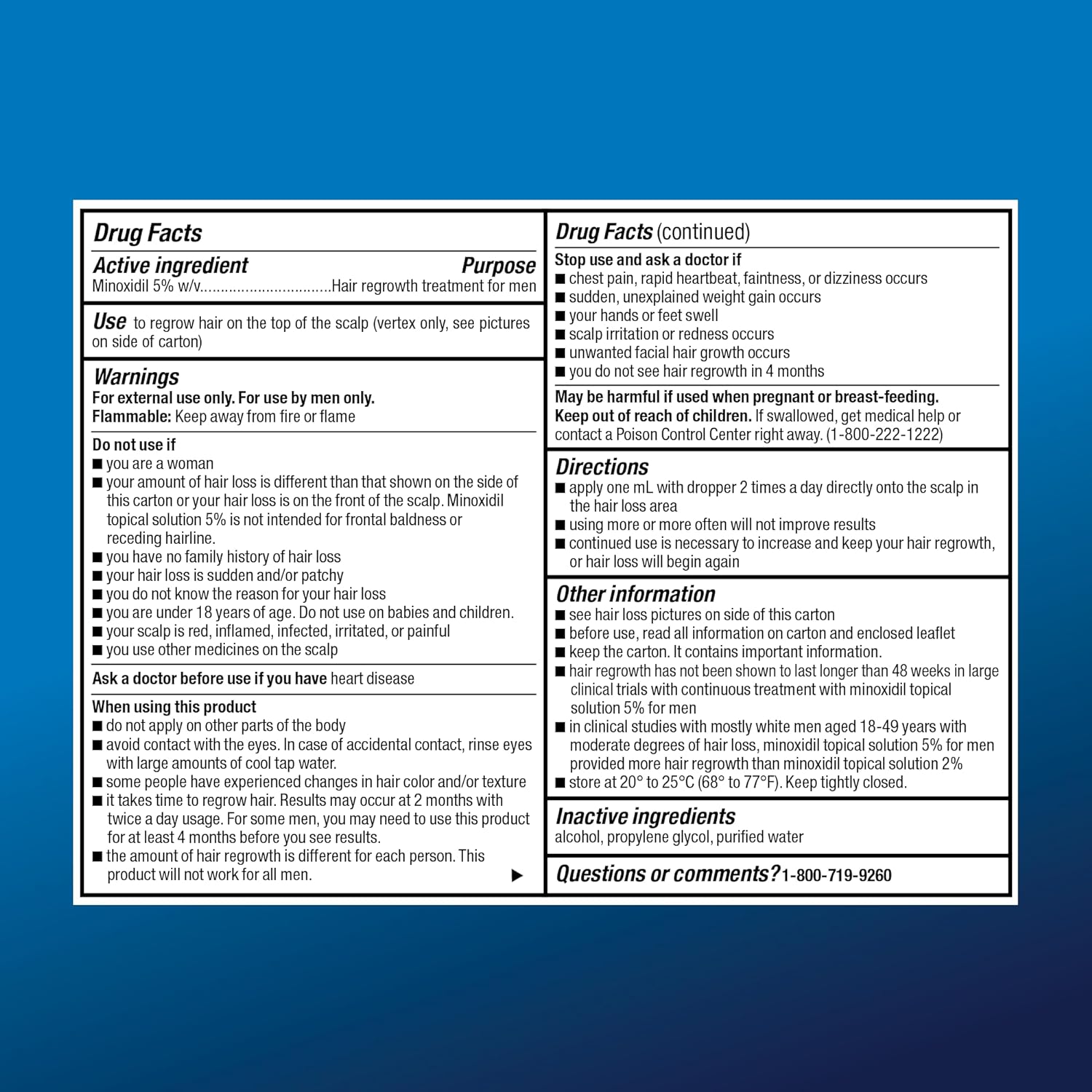 About this item ACTIVE INGREDIENT: This product features minoxidil 5 percent w/v, the number one dermatologist recommended active ingredient (of U.S. physicians surveyed by an independent market research firm); compare to Menās Rogaine Extra Strength active ingredient UNSCENTED HAIR REGROWTH TREATMENT: This unscented minoxidil 5 percent topical treatment reactivates hair follicles to stimulate hair regrowth EXTRA STRENGTH: Amazon Basic Care Minoxidil Topical Solution USP, 5 Percent is an extra strength solution for men to help regrow hair; includes an easy to use dropper MINOXIDIL FOR MEN: Amazon Basic Care Minoxidil Topical Solution USP, 5 Percent is for men who have a general thinning of hair on the top of the scalp (vertex only); use twice daily for best results CLINICALLY PROVEN to help regrow hair on the top of the scalp; not for use by women āŗ See more product details,ACTIVE INGREDIENT: This product features minoxidil 5 percent w/v, the number one dermatologist recommended active ingredient (of U.S. physicians surveyed by an independent market research firm); compare to Menās Rogaine Extra Strength active ingredient,UNSCENTED HAIR REGROWTH TREATMENT: This unscented minoxidil 5 percent topical treatment reactivates hair follicles to stimulate hair regrowth,EXTRA STRENGTH: Amazon Basic Care Minoxidil Topical Solution USP, 5 Percent is an extra strength solution for men to help regrow hair; includes an easy to use dropper,MINOXIDIL FOR MEN: Amazon Basic Care Minoxidil Topical Solution USP, 5 Percent is for men who have a general thinning of hair on the top of the scalp (vertex only); use twice daily for best results,CLINICALLY PROVEN to help regrow hair on the top of the scalp; not for use by women