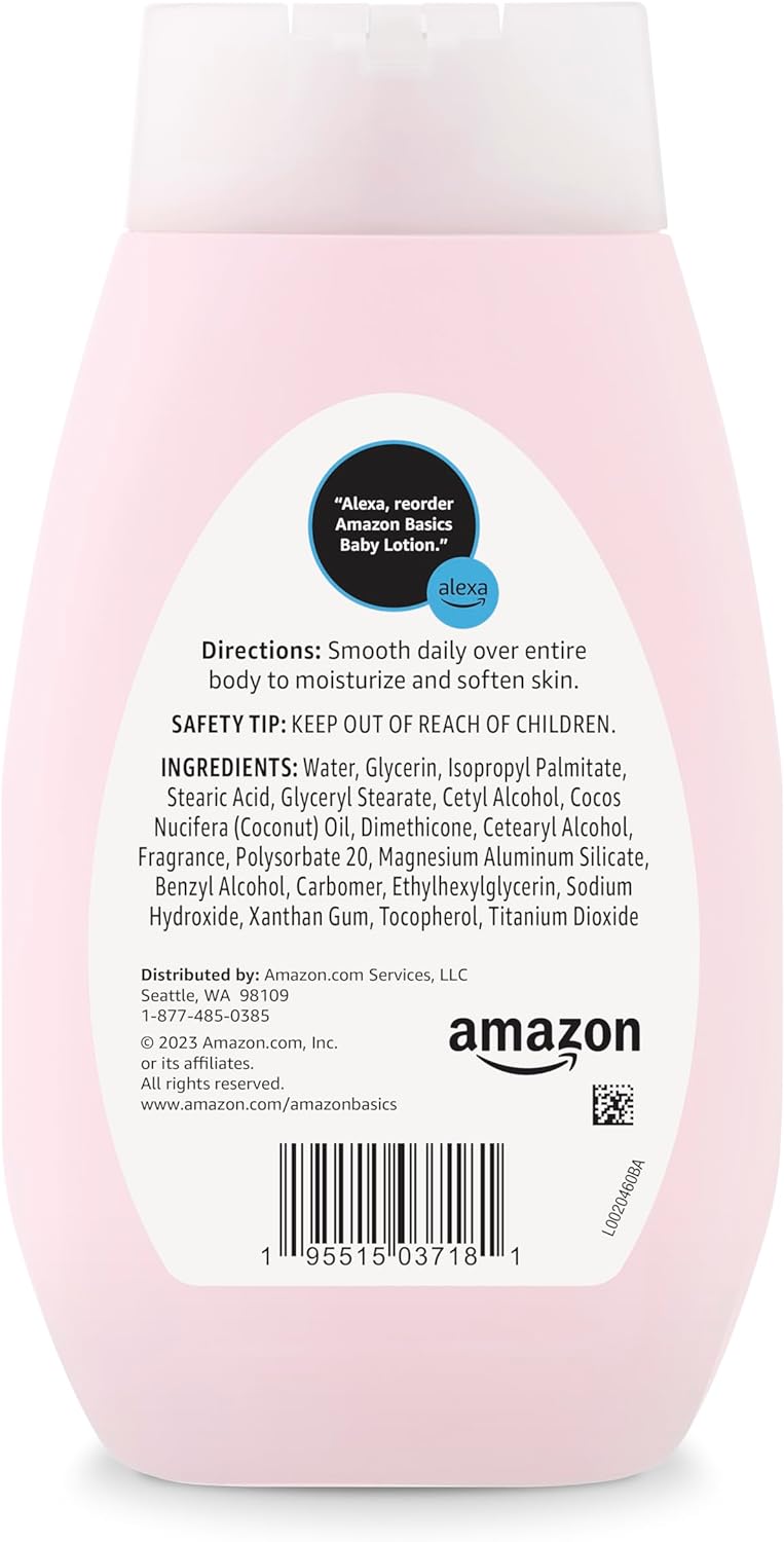 One 13.6-fluid ounce bottle of Amazon Basics Hypoallergenic Moisturizing Baby Lotion10Pediatrician and Dermatologist Tested. Hypoallergenic. Mild, and Gentle10Soothes and Softens with Delicately Scented Moisturizers10Paraben Free. Phthalate Free. Dye Free. Phenoxyethanol Free. Sulfate free. Sodium Laureth Sulfate {SLES} Free. Sodium Lauryl Sulfate {SLS} Free. Quaternium-15 {OR Q-15} Free. Formaldehyde Donor Free/DMDM10The rich moisturizers in this formula are quickly absorbed by baby’s delicate skin to prevent drying