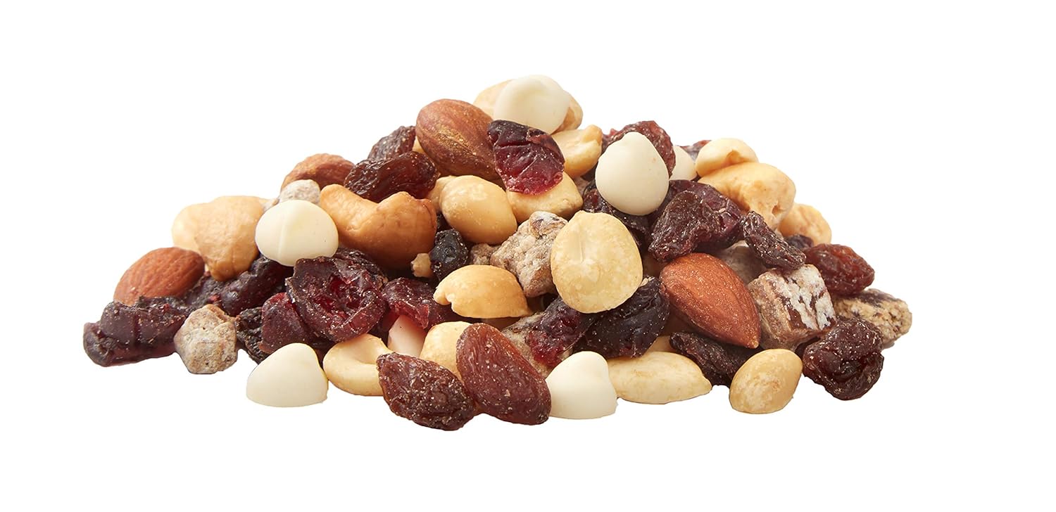 A mix of roughly 30% peanuts, 20% raisins, 19% dried cranberries, 10% yogurt flavored drops, 9% dates, 8% cashews, and 4% almonds (actual percentages may vary slightly from bag to bag)