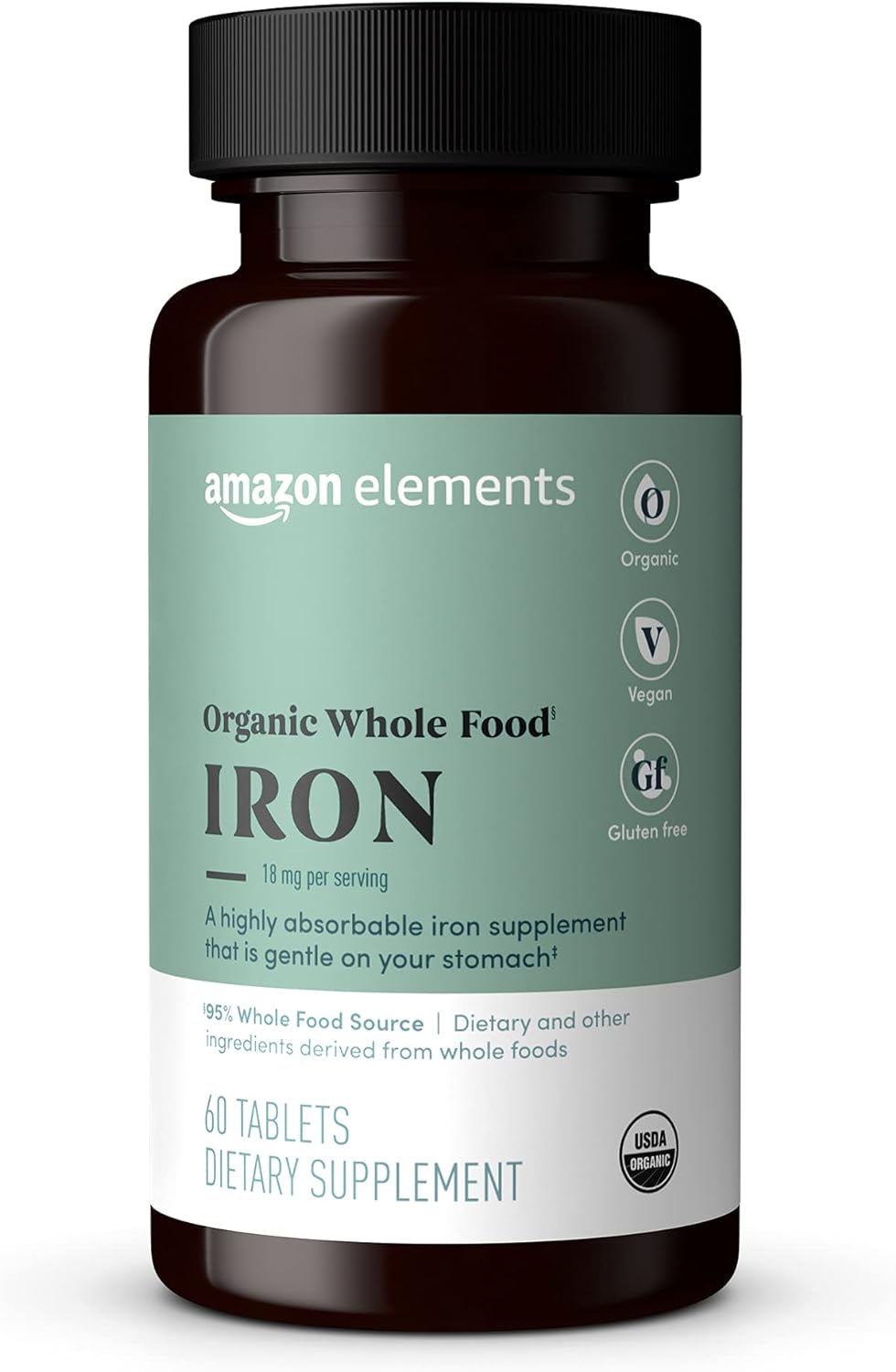 Organic Whole Food Iron, dietary supplement, 60 tablets95% Whole Food Source; Dietary and other ingredients derived from whole foodsA highly absorbable iron supplement that is gentle on your stomachUSDA organic certified, non-GMO ingredients, vegan certified, and gluten freeAlexa voice shopping enabled: to place your next order, just say, “Alexa, reorder Amazon Elements Iron.”