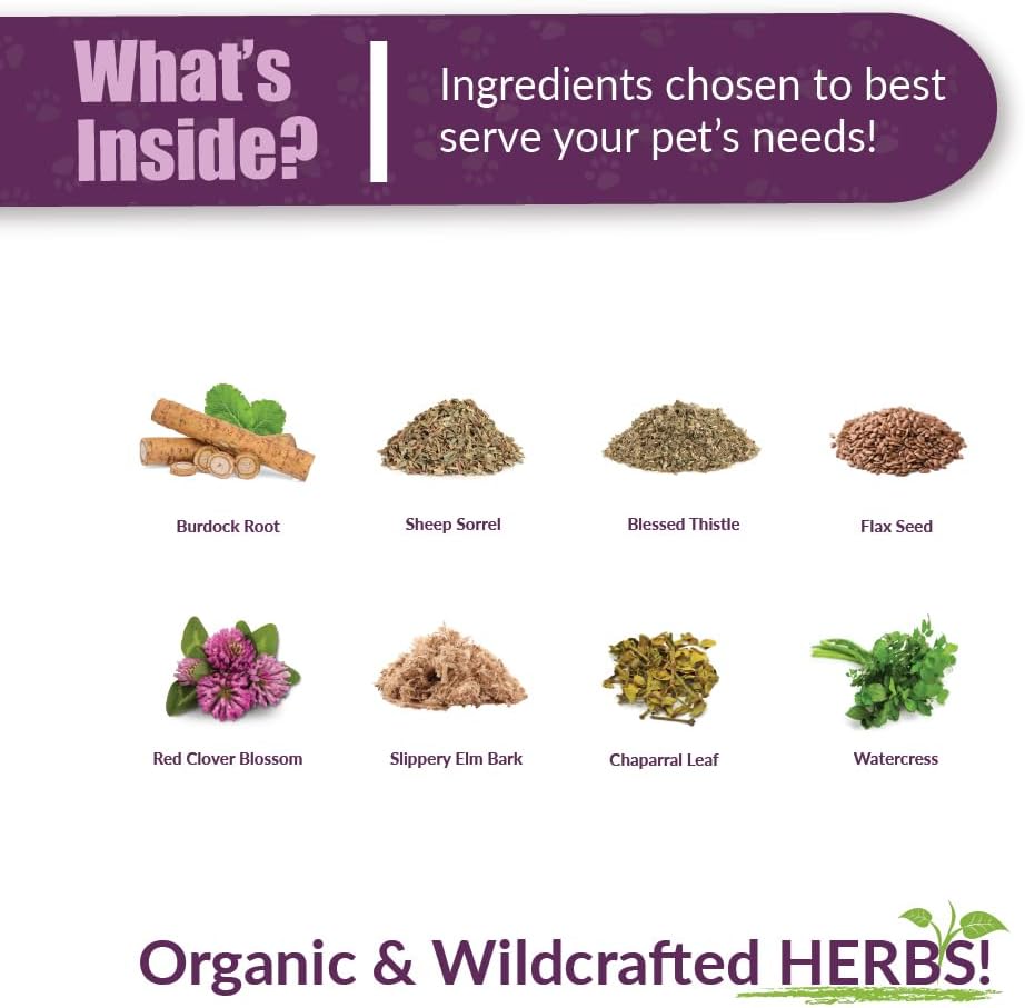 Herbal Blend Product: Amber NaturalZ Life Cell Support Herbal Supplement for Dog, Cat, Bird, Guinea Pig, and Rabbit is globally sourced and manufactured in the USA containing our proprietary blend of organic and wildcrafted herbs including Burdock Root, Sheep Sorrel, Blessed Thistle, Flax Seed, Red Clover Blossom, Slippery Elm Bark, Chaparral Leaf, and Watercress