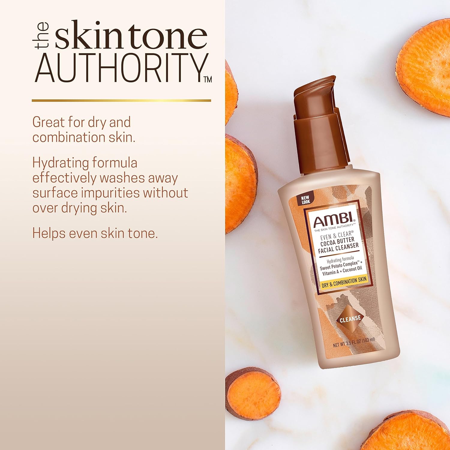 About this item Facial Cleanser: This hydrating formula washes away surface impurities without stripping the skin, featuring Cocoa Butter and Coconut Oil to provide skin with a double dose of moisture With Sweet Potato Complex: Known as a "beauty food," sweet potatoes are power-packed with antioxidants and Vitamins A, C and E that help fight hyperpigmentation and promote healthy, glowing and even-toned skin The Ambi Regimen: We make dermatologist-recommended products to cleanse, moisturize and nourish, help fade dark spots and discoloration, treat acne, and even skin tone, and other solutions for melanin-rich skin Your Skincare Journey: For smooth, even-toned, flawless looking skin try our cleansers, bar soaps, serums, moisturizers and fade creams specifically formulated for and by those with diverse skin tones The Skin Tone Authority: For 50 years, Ambi has been rooted in catering to the skincare needs of women of color, blending science and nature to create affordable, high-quality skincare products See more product details,Facial Cleanser: This hydrating formula washes away surface impurities without stripping the skin, featuring Cocoa Butter and Coconut Oil to provide skin with a double dose of moisture,With Sweet Potato Complex: Known as a "beauty food," sweet potatoes are power-packed with antioxidants and Vitamins A, C and E that help fight hyperpigmentation and promote healthy, glowing and even-toned skin,The Ambi Regimen: We make dermatologist-recommended products to cleanse, moisturize and nourish, help fade dark spots and discoloration, treat acne, and even skin tone, and other solutions for melanin-rich skin,Your Skincare Journey: For smooth, even-toned, flawless looking skin try our cleansers, bar soaps, serums, moisturizers and fade creams specifically formulated for and by those with diverse skin tones,The Skin Tone Authority: For 50 years, Ambi has been rooted in catering to the skincare needs of women of color, blending science and nature to create affordable, high-quality skincare products