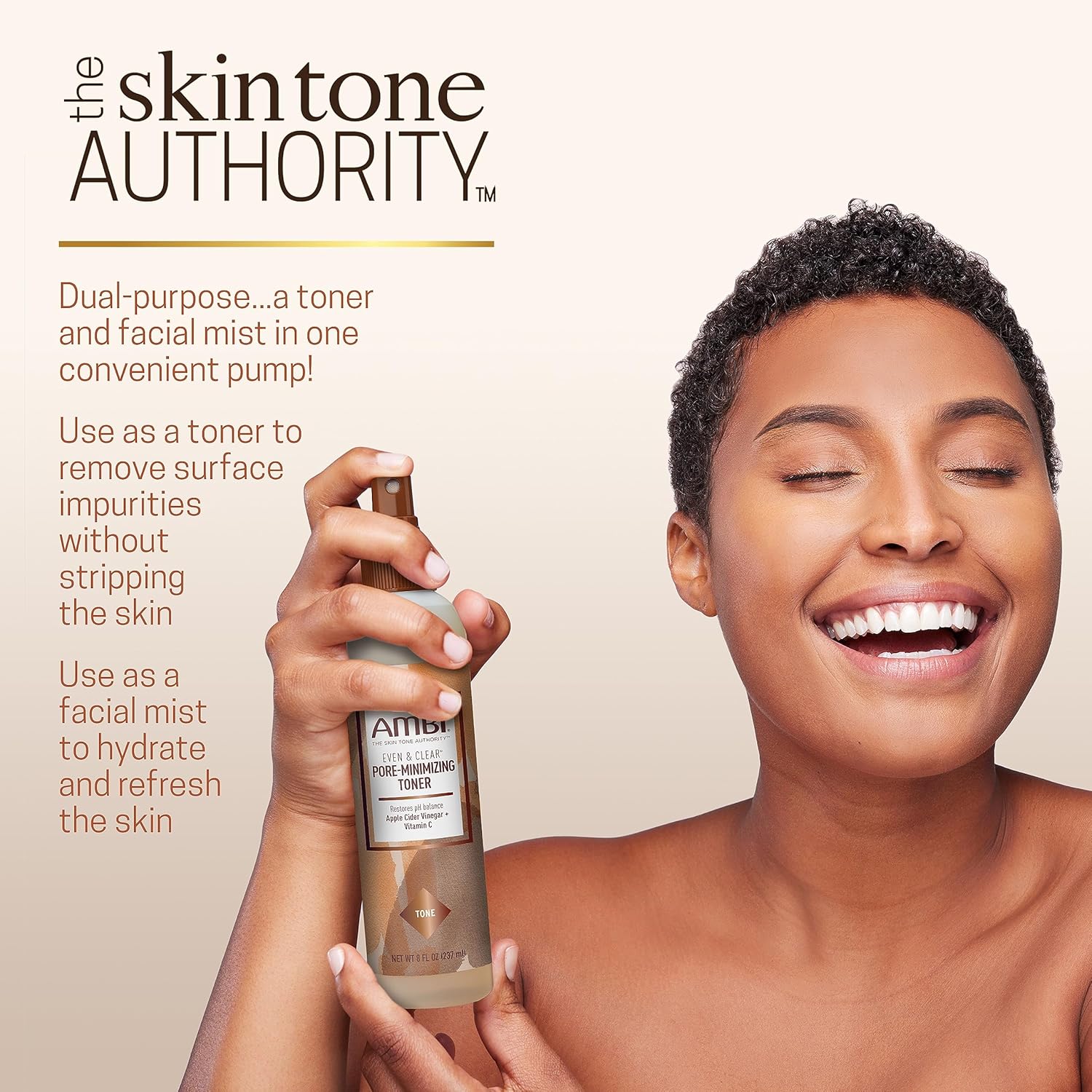 Ambi Even & Clear Intense Clarifying Toner is a dual-purpose item: a Clarifying Toner (which removes surface impurities without stripping the skin) and a Facial Mist (which hydrates and refreshes the skin). It is specifically formulated with Licorice Root Extract which helps even skin tone and antioxidant-rich Vitamin C which helps support skin rejuvenation and adds glow to skin. It also includes Apple Cider Vinegar which removes oil, minimizes, pores and helps balance skin's pH,Clarifying Toner: This astringent/toner is formulated to protect and beautify acne prone skin, helping remove surface impurities without stripping the skin while hydrating and refreshing,Rejuvenating Formula: With Licorice Root Extract to help even skin tone, antioxidant-rich Vitamin C to help support rejuvenation and add glow to skin, plus Apple Cider Vinegar which removes oil, minimizes pores and helps balance pH,The Ambi Regimen: We make dermatologist-recommended products to cleanse, moisturize and nourish, help fade dark spots and discoloration, treat acne, and even skin tone, and other solutions for melanin-rich skin,Your Skincare Journey: For smooth, even-toned, flawless looking skin try our cleansers, bar soaps, serums, moisturizers and fade creams specifically formulated for and by those with diverse skin tones,The Skin Tone Authority: For 50 years, Ambi has been rooted in catering to the skincare needs of women of color, blending science and nature to create affordable, high-quality skincare products