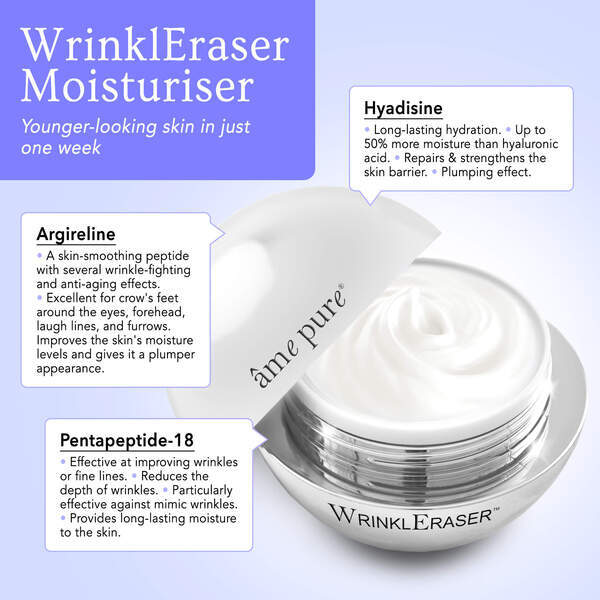 Product Information:This luxurious and powerful wrinkle-fighting moisturizer is clinically proven to generate visibly younger-looking skin in just one week,Features:This luxurious and powerful anti-wrinkle face cream is clinically proven to generate visibly younger-looking skin in just one week and provide a perfect face care. This wrinkle cream’s lightweight formula delivers intense 24-hour skin hydration; in fact, the face moisturizer has been shown to have a greater moisturizing capacity than hyaluronic acid. The face cream for mature skin contains high doses of 3 unique age-resetting active ingredients (13%). As a result, the skin treated by WrinklEraser face cream for mature skin becomes lusciously smoother and softer; it acquires a more youthful and plumped appearance while fine lines and wrinkles are filled in and smoothed out by day and night cream for women anti aging. This face moisturizer for women is recommended for any woman who has either used or is still using the âme pure CIT Face Roller. Combining WrinklEraser face cream with the procedure accelerates results and ensures long-lasting effects upon completion of an 8-week course of treatment. WrinklEraser moisturiser is ideal for: - Lines and wrinkles - Dryness, dehydration - Dullness, loss of radiance - Loss of firmness - All skin types Advantages: - Does not clog pores - Paraben-free - Sulphate-free - Phthalate-free - Silicone-free - Non-GMO - Cruelty-free,Warning or Restrictions:Keep out of reach of children,Product Specification:Aqua, Glycerin, Macadamia Ternifolia Seed Oil, Cocos Nucifera Oil, Glyceryl Stearate, Cetearyl Alcohol, Simmondsia Chinensis Seed Oil, Theobroma Cacao Seed Butter, Dimethicone, Potassium Cetyl Phosphate, Stearic Acid, Palmitic Acid, Pentapeptide-18, Acetyl Hexapeptide-8, Pseudoalteromonas Exopolysacharides, Tocopheryl Acetate, Urea, Acrylates/C10-30 Alkyl Acrylate Crosspolymer, Triethanolamine, Cholesterol, Citric Acid, Disodium EDTA, Caprylyl Glycol, Phenoxyethanol, Chlorphenesin, Sodium Salicylate, Parfum, Benzyl Salicylate, Citronellol, Coumarin, Geraniol, Hexyl Cinnamal, Linalool,Product Uses:Apply the crème on clean skin of the face, neck and décolleté in the morning and/or in the evening. Gently massage a small quantity of the lightweight Crème over the area to be treated until it is absorbed. When used together with an âme pure® microneedling device, the Crème should not be applied on the night when performing the microneedling procedure