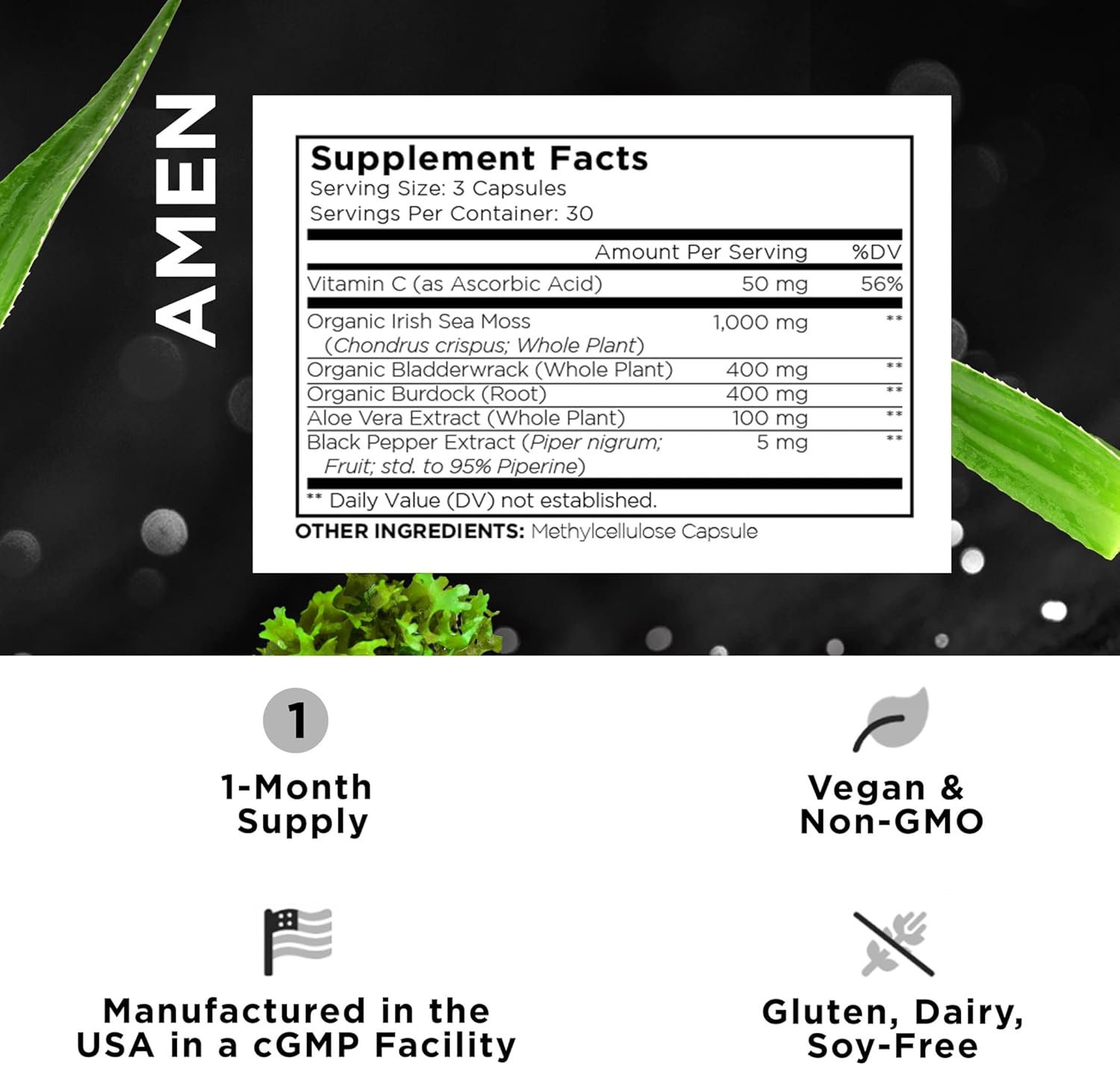 About this item Nutrient-Rich Sea Moss Blend: Amen Sea Moss features 1,000 mg of organic Irish sea moss, 400 mg of organic bladderwrack, and 400 mg of organic burdock root per serving, offering a potent combination of botanicals. Enhanced with Vitamin C and Aloe Vera: This Irish sea moss supplement also includes Vitamin C, aloe vera extract, and black pepper extract to complement the sea moss blend. Vegan and Allergen-Friendly: This seaweed and superfood formula is non-GMO, dairy-free, soy-free, gluten-free, and vegan— making it a safe and healthy choice for various dietary preferences and restrictions. Convenient: Each bottle of Amen Irish moss capsules contains 30 servings, providing a full month of daily use, which you can conveniently incorporate into your wellness routine. Manufactured in the USA: Amen Sea Moss is manufactured in the USA with global ingredients in a cGMP-certified facility for quality and purity. › See more product details,Nutrient-Rich Sea Moss Blend: Amen Sea Moss features 1,000 mg of organic Irish sea moss, 400 mg of organic bladderwrack, and 400 mg of organic burdock root per serving, offering a potent combination of botanicals,Enhanced with Vitamin C and Aloe Vera: This Irish sea moss supplement also includes Vitamin C, aloe vera extract, and black pepper extract to complement the sea moss blend,Vegan and Allergen-Friendly: This seaweed and superfood formula is non-GMO, dairy-free, soy-free, gluten-free, and vegan— making it a safe and healthy choice for various dietary preferences and restrictions,Convenient: Each bottle of Amen Irish moss capsules contains 30 servings, providing a full month of daily use, which you can conveniently incorporate into your wellness routine,Manufactured in the USA: Amen Sea Moss is manufactured in the USA with global ingredients in a cGMP-certified facility for quality and purity