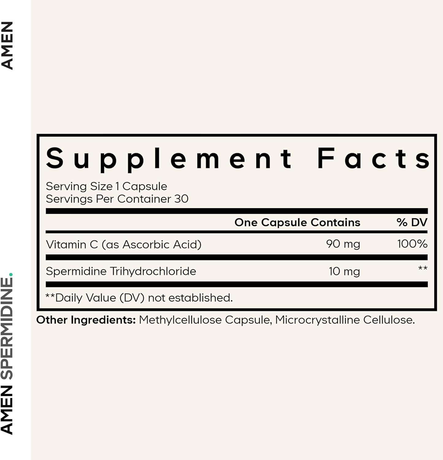 About this item Spermidine Formula: Amen Spermidine delivers 10 mg of spermidine trihydrochloride per serving, offering a focused and streamlined way to include this ingredient in your daily routine. Vitamin C: This spermidine capsule supplement also features 90 mg of vitamin C as ascorbic acid in each serving. 1 Capsule per Serving: This spermidine and vitamin C formula is convenient to use with just 1 capsule per serving. Each Amen Spermidine pills bottle contains 30 servings for a 1-month supply. Dietary-Friendly: This spermidine supplement is vegan, non-GMO, gluten-free, dairy-free, and soy-free. Amen spermidinesupplement is suitable for diverse dietary preferences. Manufactured in the USA: Amen Spermidine capsule supplement is manufactured in the USA with global ingredients in a cGMP-certified facility for quality and purity. › See more product details,Spermidine Formula: Amen Spermidine delivers 10 mg of spermidine trihydrochloride per serving, offering a focused and streamlined way to include this ingredient in your daily routine,Vitamin C: This spermidine capsule supplement also features 90 mg of vitamin C as ascorbic acid in each serving,1 Capsule per Serving: This spermidine and vitamin C formula is convenient to use with just 1 capsule per serving. Each Amen Spermidine pills bottle contains 30 servings for a 1-month supply,Dietary-Friendly: This spermidine supplement is vegan, non-GMO, gluten-free, dairy-free, and soy-free. Amen spermidinesupplement is suitable for diverse dietary preferences,Manufactured in the USA: Amen Spermidine capsule supplement is manufactured in the USA with global ingredients in a cGMP-certified facility for quality and purity
