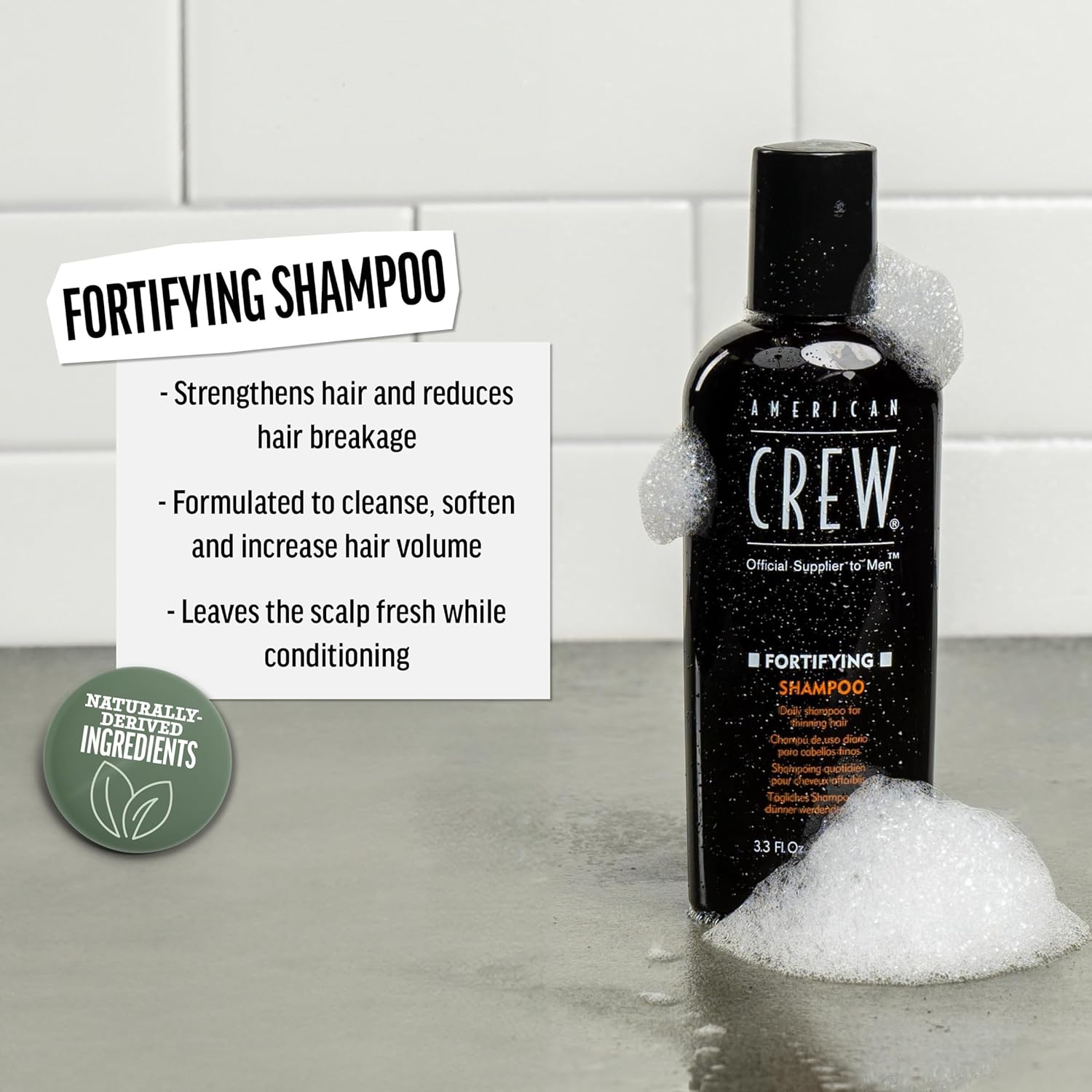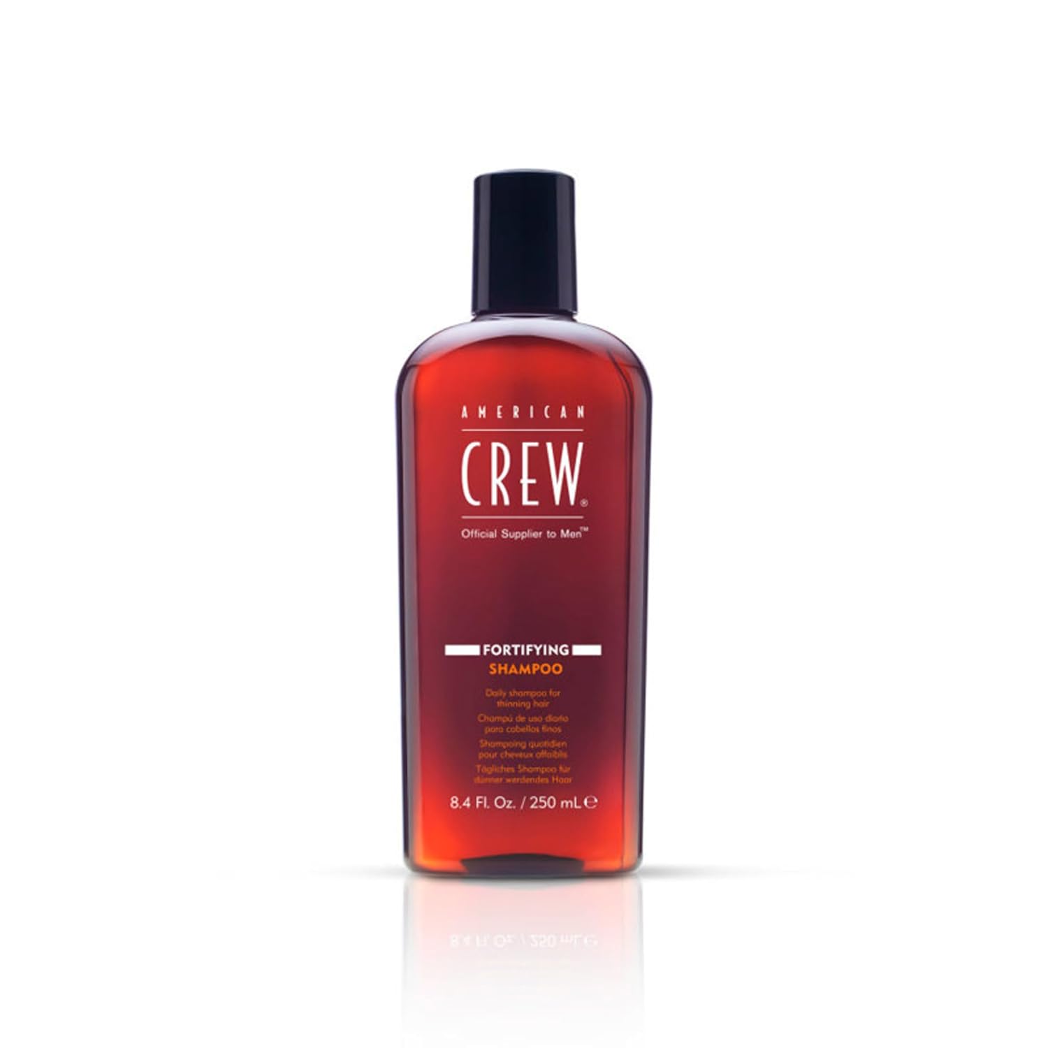 Product Description American Crew's Fortifying Shampoo for Men's Hair Care is a daily shampoo that removes buildup, refreshes the scalp, and leaves hair soft and clean. It's designed to cleanse, soften, and increase hair volume. Simply wet hair, massage a small amount in, and rinse well. Elevate your style with American Crew, a leader in men's grooming. Brand Story As the global leader in men's grooming and the "Official Supplier to Men", American Crew's ongoing commitment is to elevate men's style and enhance their personal image by providing education and sharing our brand vision,FORTIFYING SHAMPOO: A daily shampoo for thinning hair that removes buildup, refreshes the scalp, and leaves the hair soft and clean,HAIR CARE FOR MEN: Contains ingredients that cleanse, soften and help to increase hair volume,KEY BENEFITS: Refreshes the scalp as it conditions, removes buildup,HOW TO USE: Use on fine hair. Wet hair thoroughly. Massage a small amount into hair and scalp. Rinse well. Use daily,WHO WE ARE: American Crew is a leader in, Men's Grooming for HAIR, BODY, BEARD, SHAVE, STYLE categories. American Crew's ongoing commitment is to elevate men's style and enhance their personal image