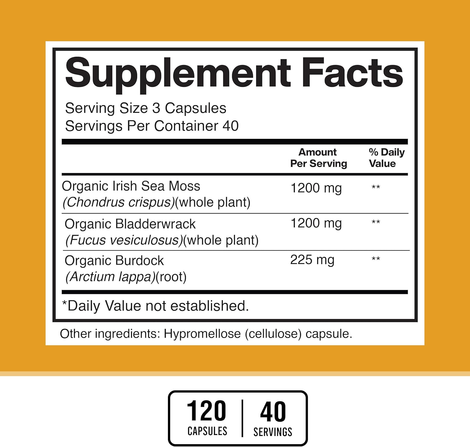 Powerful Trio: American Standard Supplements Irish Sea Moss supplement contains 1200mg of Irish Sea Moss, 1200mg of Bladderwrack, and 225mg of Burdock Root in each serving, providing a powerful synergy of marine and herbal nutrients