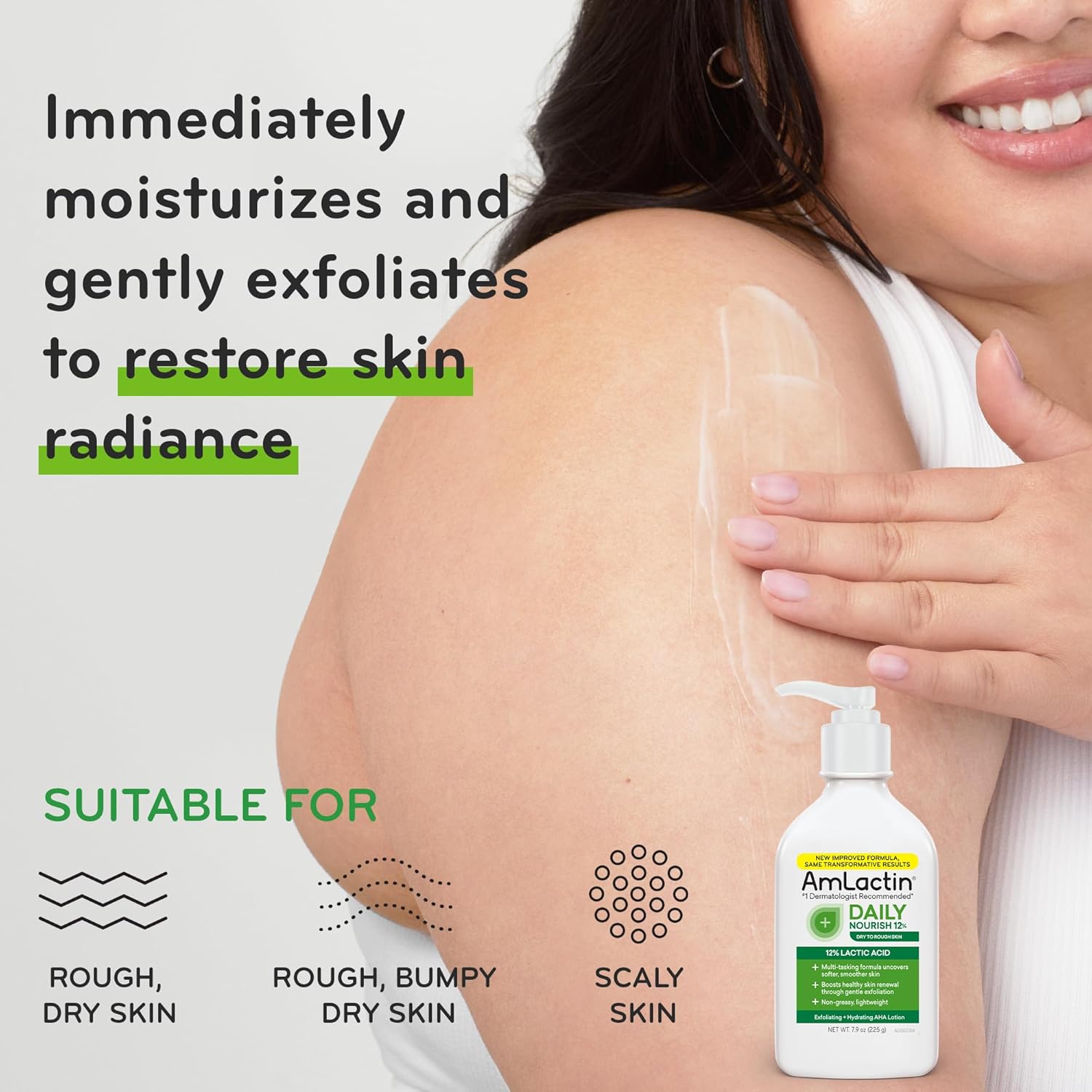 Daily Nourish Lotion: Our therapeutic formula leverages 12% lactic acid, a gentle yet effective AHA that exfoliates to promote skin cell turnover while hydrating to boost daily skin radiance; suitable as a face, hand & body lotion