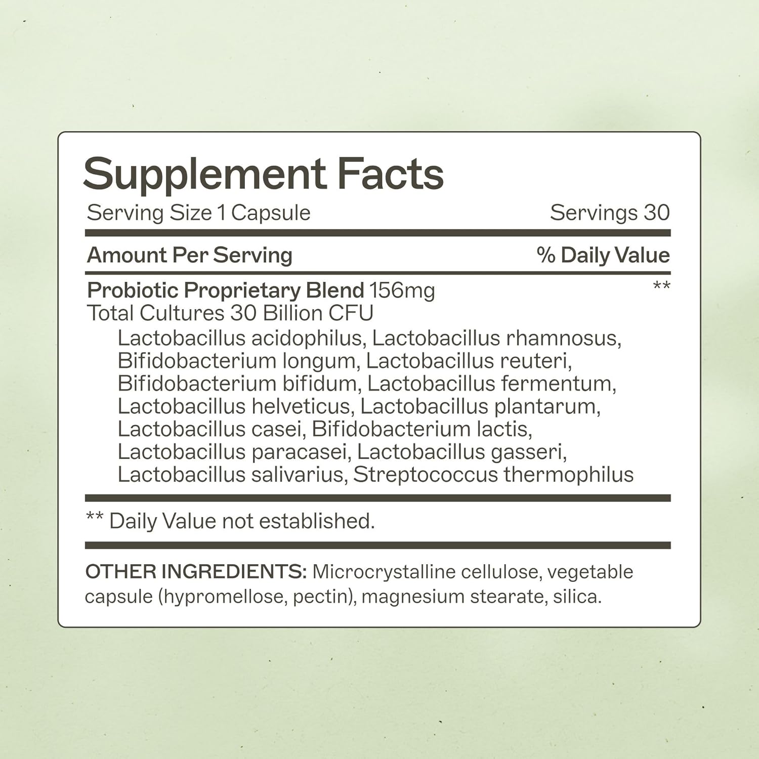 About this item This 30 billion CFU (Colony Forming Units) probiotic blend helps promote beneficial microflora populations in the GI tract Formulated with 14 clinically studied strains for premium benefits Assists with optimal digestion and nutrient utilization Helps support and maintain immune system function Supplements for Health Empowerment: These functional solutions are designed to empower and educate people to take back their health See more product details,This 30 billion CFU (Colony Forming Units) probiotic blend helps promote beneficial microflora populations in the GI tract,Formulated with 14 clinically studied strains for premium benefits,Assists with optimal digestion and nutrient utilization,Helps support and maintain immune system function,Supplements for Health Empowerment: These functional solutions are designed to empower and educate people to take back their health