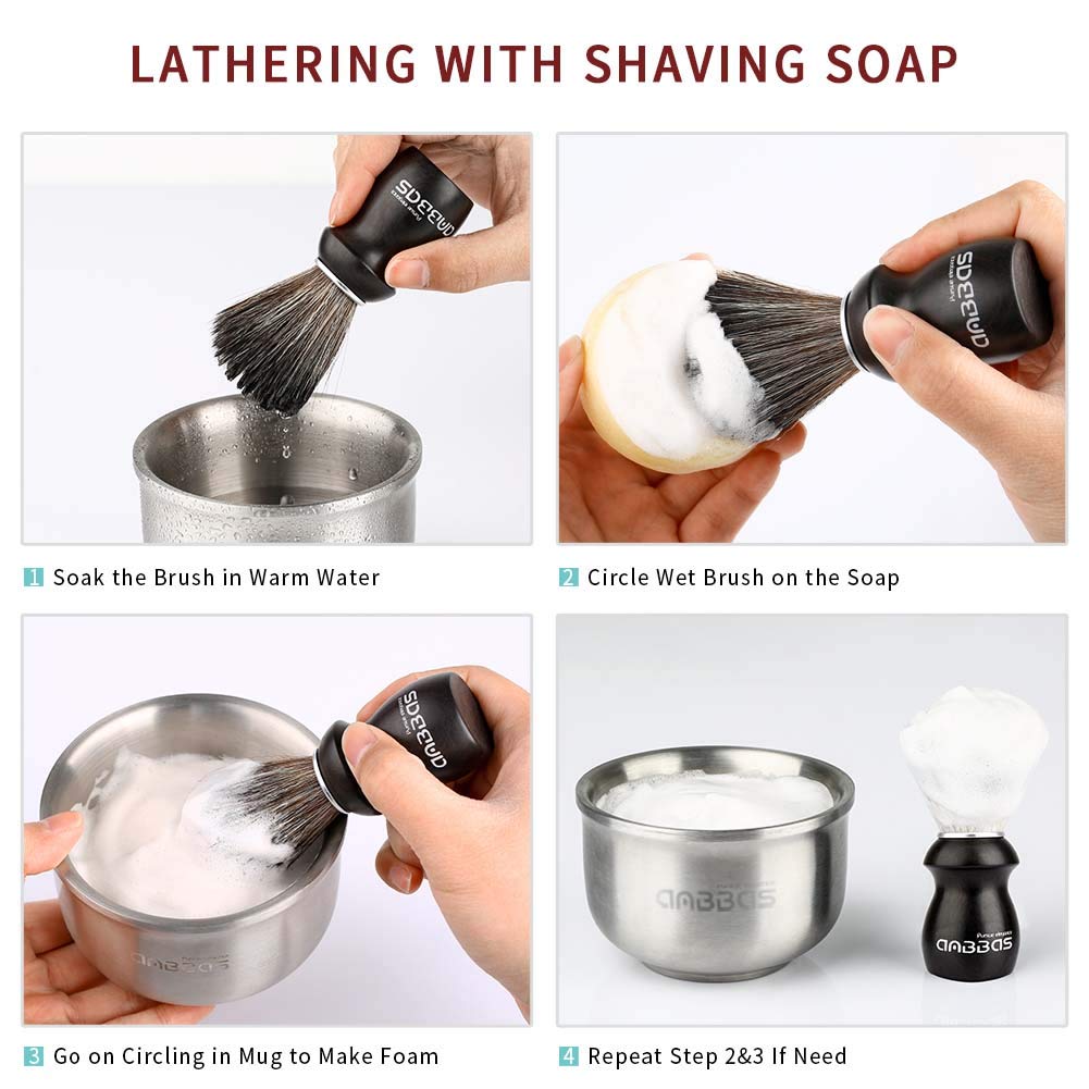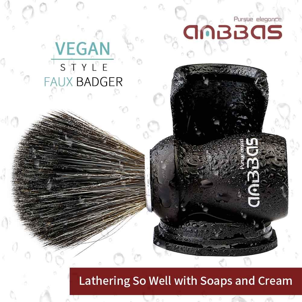 VEGAN FAVOR: Free of animal fur, synthetic badger hair, also silky soft, no smell, doesn't lose any hair, rinses easily, kind for all skins. COMPATIBILITY: Works well with all kinds soaps as well as any foams, gels or creams, could generate rich and fine lather. HOME & JOURNEY: Dry almost right now after rinsing and shaking it several times, also with a height adjustable premium plastic case tube for brush, compatible, light and portable great for travel and home use. GIFT IDEA: Perfect gift for your father, husband, boyfriend or for any wet shavers looking for a fabulous combination. ACCESSORY: Package with a contracted design plactic brush stand; Recommend thoroughly clean the shaving brush after each use and hang it to dry for brush long service lifetime. See more product details,VEGAN FAVOR: Free of animal fur, synthetic badger hair, also silky soft, no smell, doesn't lose any hair, rinses easily, kind for all skins,COMPATIBILITY: Works well with all kinds soaps as well as any foams, gels or creams, could generate rich and fine lather,HOME & JOURNEY: Dry almost right now after rinsing and shaking it several times, also with a height adjustable premium plastic case tube for brush, compatible, light and portable great for travel and home use,GIFT IDEA: Perfect gift for your father, husband, boyfriend or for any wet shavers looking for a fabulous combination,ACCESSORY: Package with a contracted design plactic brush stand; Recommend thoroughly clean the shaving brush after each use and hang it to dry for brush long service lifetime