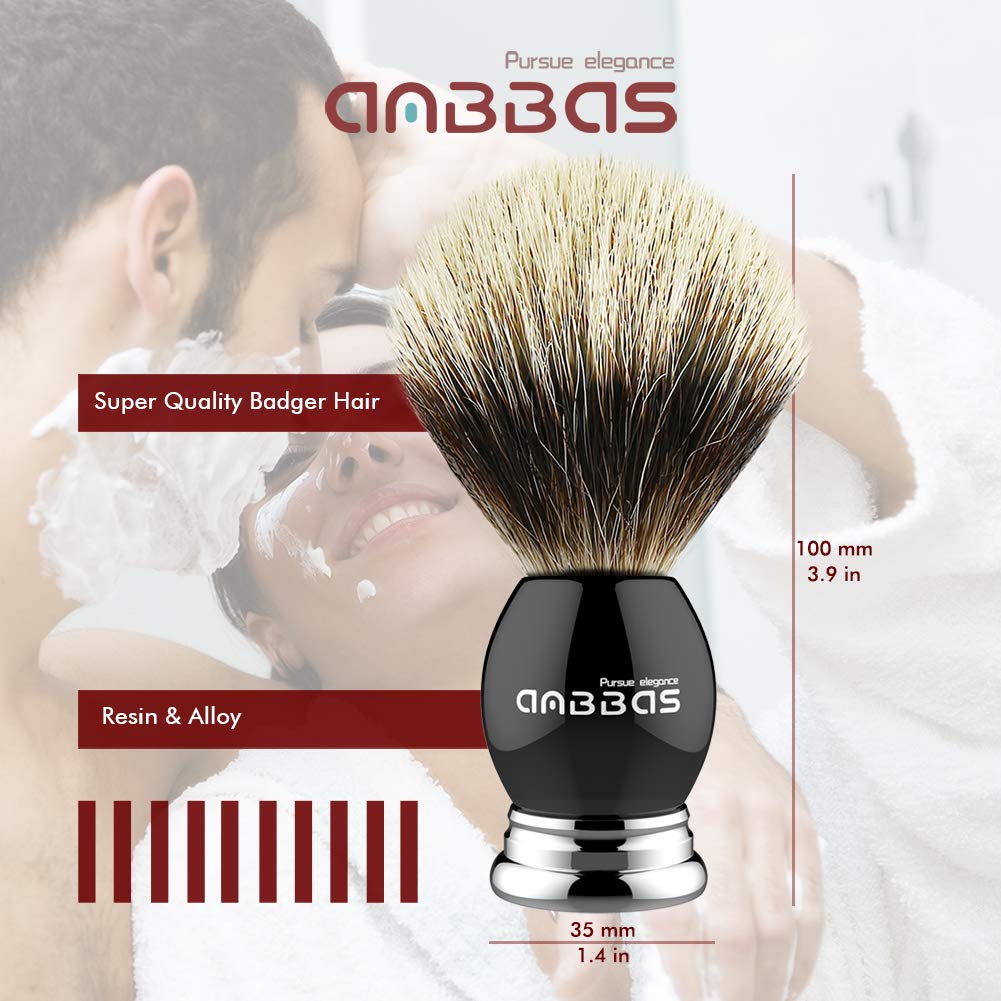 TECHNOLOGY: Handcrafted production,every brush hair need to go through 25 screening procedures, absolute silvertip badger hair, with wonderful shape and no shedding, no terrible smell,design with high quality resin & alloy handle,texture and fashion CHARACTER: Silvertip badger hair is silky and firm, great for massage; as water absorbing and heat retention capability, works well with all shaving soap and foams, gels or creams, perfect for thick, glossy lathering, easy to clean, and fairly quick to dry PURPOSE: Perfect for who like traditional wet shaving, great gift idea for your father, husband, boyfriend or for any wet shavers TIPS: Recommend thoroughly rinse the shaving brush, shake and hang it to dry. The longevity of a quality badger hair shaving brush is directly related to the care and respect it is given PACKAGE: 1 Badger Shaving Brush, 1 Razor and Brush Stand Holder; 1 Package Box; Anbbas complete service system  See more product details,TECHNOLOGY: Handcrafted production,every brush hair need to go through 25 screening procedures, absolute silvertip badger hair, with wonderful shape and no shedding, no terrible smell,design with high quality resin & alloy handle,texture and fashion,CHARACTER: Silvertip badger hair is silky and firm, great for massage; as water absorbing and heat retention capability, works well with all shaving soap and foams, gels or creams, perfect for thick, glossy lathering, easy to clean, and fairly quick to dry,PURPOSE: Perfect for who like traditional wet shaving, great gift idea for your father, husband, boyfriend or for any wet shavers,TIPS: Recommend thoroughly rinse the shaving brush, shake and hang it to dry. The longevity of a quality badger hair shaving brush is directly related to the care and respect it is given,PACKAGE: 1 Badger Shaving Brush, 1 Razor and Brush Stand Holder; 1 Package Box; Anbbas complete service system