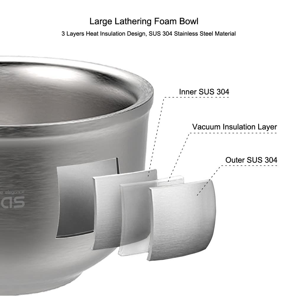 HUGE BOWL: Textured & durable food-grade SUS 304 stainless steel; Unique craftsmanship inside is convenient for making a rich,thick,luxurious foam to shave with shaving soap cream gel, etc
