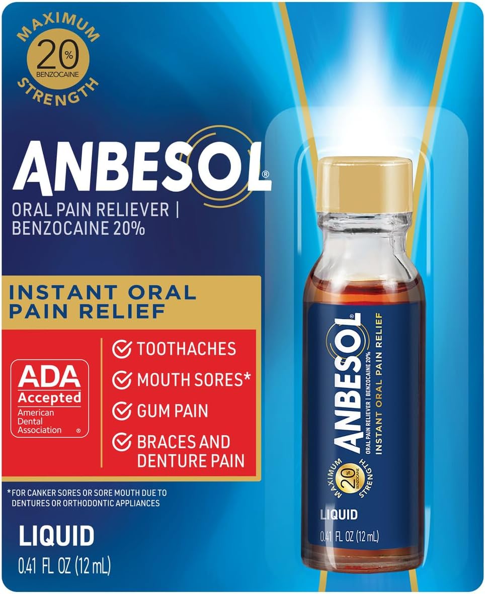About this item Instant Oral Pain Relief: Anbesol Maximum Strength Liquid for mouth pain, including toothache pain, canker sores, sore gums, mouth sores, denture pain, braces, retainer and aligner pain, and minor dental procedures OW to WOW! Instantly: Formulated with the active ingredient Benzocaine, an oral pain reliever, and numbs instantly to temporarily relieve toothaches, gum pain, canker sores and aligner pain. Liquid Formula: Anbesol Liquid Formula goes on clear and is undetectable, stays where you apply it, and provides fast and effective numbing of oral pain ADA Accepted: Accepted by the American Dental Association and has shown efficacy to help temporarily relieve discomfort of mouth sores Convenient: Take the tiny Anbesol gel tube with you for oral pain relief on-the-go up to 4x daily. For adults and children 2 years and older with adult supervision. Use as directed See more product details,Instant Oral Pain Relief: Anbesol Maximum Strength Liquid for mouth pain, including toothache pain, canker sores, sore gums, mouth sores, denture pain, braces, retainer and aligner pain, and minor dental procedures,OW to WOW! Instantly: Formulated with the active ingredient Benzocaine, an oral pain reliever, and numbs instantly to temporarily relieve toothaches, gum pain, canker sores and aligner pain,Liquid Formula: Anbesol Liquid Formula goes on clear and is undetectable, stays where you apply it, and provides fast and effective numbing of oral pain,ADA Accepted: Accepted by the American Dental Association and has shown efficacy to help temporarily relieve discomfort of mouth sores,Convenient: Take the tiny Anbesol gel tube with you for oral pain relief on-the-go up to 4x daily. For adults and children 2 years and older with adult supervision. Use as directed