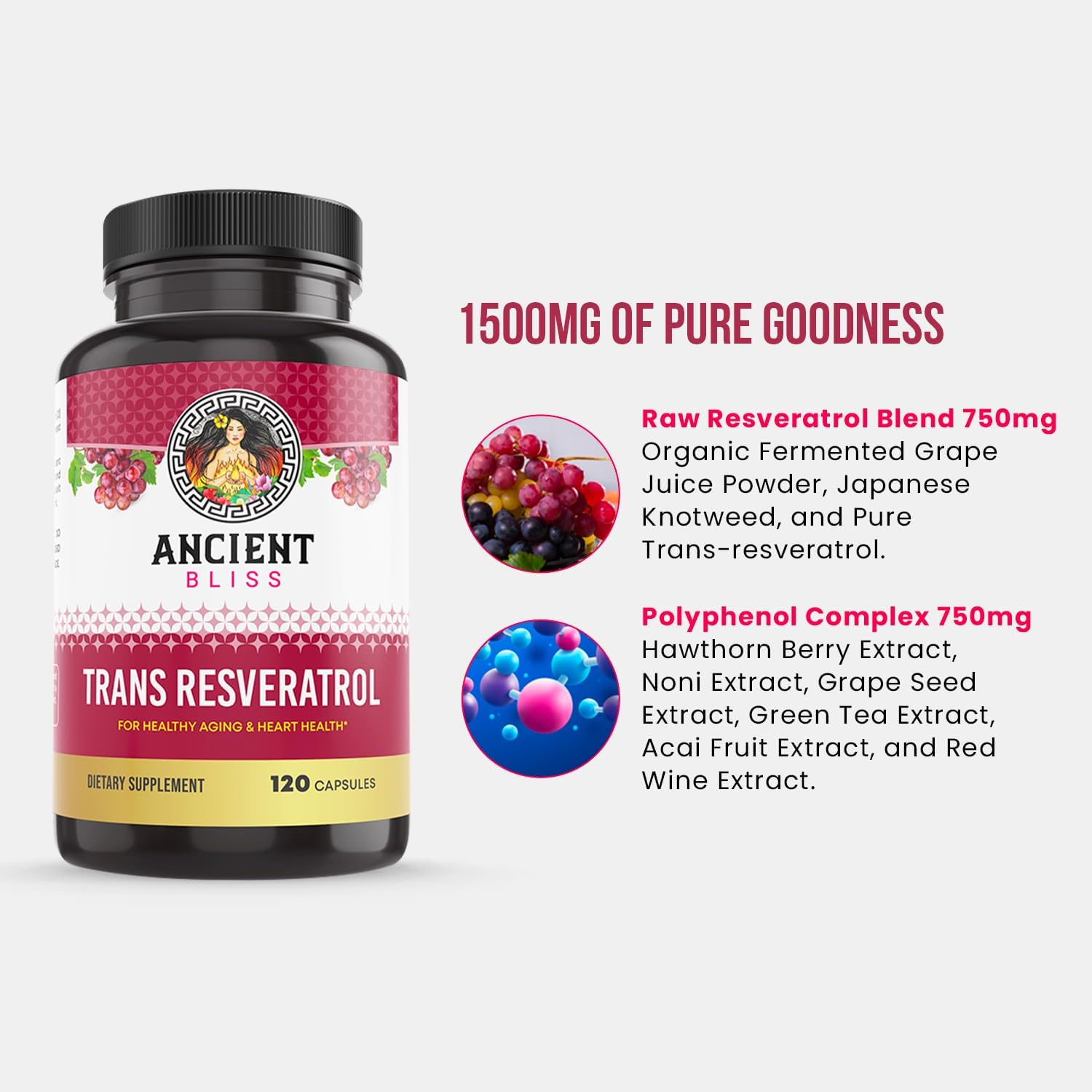 Ancient Bliss Resveratrol Powerful Antioxidant Supplement With Green Tea, Grape Seed Extract For Healthy Aging For Men & Women