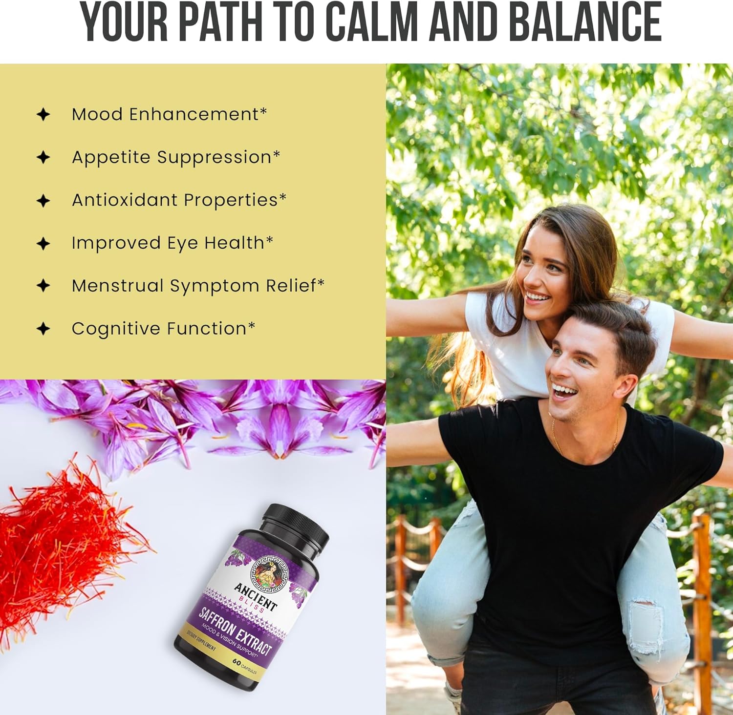 Ancient Bliss Saffron Extract Capsules Mood & Eye Support Supplement, Saffron Extract Appetite Suppressant Weight Management For Women & Men (60 Capsules)