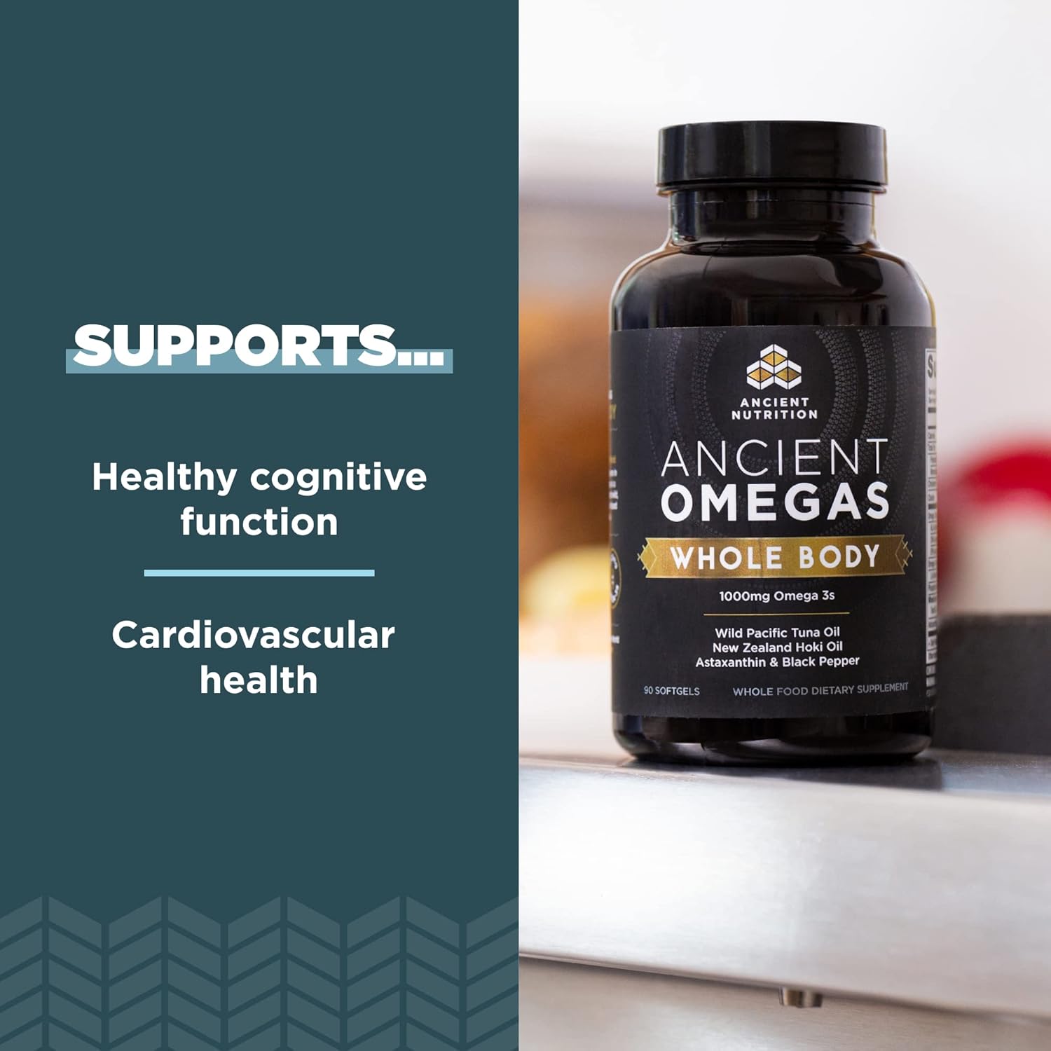 About this item TRIPLE STRENGTH: Ancient Nutritionās Ancient Omegas Whole Body provides a powerful blend of wild harvest fish oil and roe oil, plus organic chia seed oil and botanicals to support healthy cognitive function, and cardiovascular health. ALL IN ONE: Features omega-3, omega-6 and omega-9 from four fatty acids -- alpha linolenic acid (ALA), docosahexaenoic acid (DHA), eicosapentaenoic acid (EPA) and eicosatetraenoic acid (ETA) -- in high quality form. WILD & PURE: Sourced from wild caught tuna, hoki fish and hoki roe. Many fish oils on the market are highly processed. Not Ancient Omegas Whole Body. BOTANICAL SUPPORT: A powerful organic botanical blend supports absorption, a healthy response to oxidative stress, healthy eye function, boosts exercise performance and more. In short, they have an added benefit to this all-in-one omega supplement. Our Ancient Promise: Not satisfied Let us know and weāll happily provide a refund within 60 days of purchase. Ancient Nutrition guarantees your complete satisfaction when purchasing exclusively from Ancient Nutrition on Amazon See more product details,TRIPLE STRENGTH: Ancient Nutritionās Ancient Omegas Whole Body provides a powerful blend of wild harvest fish oil and roe oil, plus organic chia seed oil and botanicals to support healthy cognitive function, and cardiovascular health,ALL IN ONE: Features omega-3, omega-6 and omega-9 from four fatty acids -- alpha linolenic acid (ALA), docosahexaenoic acid (DHA), eicosapentaenoic acid (EPA) and eicosatetraenoic acid (ETA) -- in high quality form,WILD & PURE: Sourced from wild caught tuna, hoki fish and hoki roe. Many fish oils on the market are highly processed. Not Ancient Omegas Whole Body,BOTANICAL SUPPORT: A powerful organic botanical blend supports absorption, a healthy response to oxidative stress, healthy eye function, boosts exercise performance and more. In short, they have an added benefit to this all-in-one omega supplement,Our Ancient Promise: Not satisfied Let us know and weāll happily provide a refund within 60 days of purchase. Ancient Nutrition guarantees your complete satisfaction when purchasing exclusively from Ancient Nutrition on Amazon