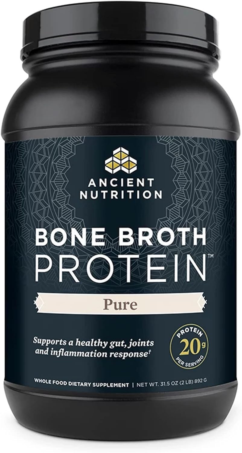 DESCRIPTION : Ancient Nutrition Bone Broth Protein Powder, Pure Flavor, 20g Protein per Serving, Supports Healthy Skin, Gut Health, Joint Supplement, Gluten Free, Paleo and Keto Friendly, 40 Servings