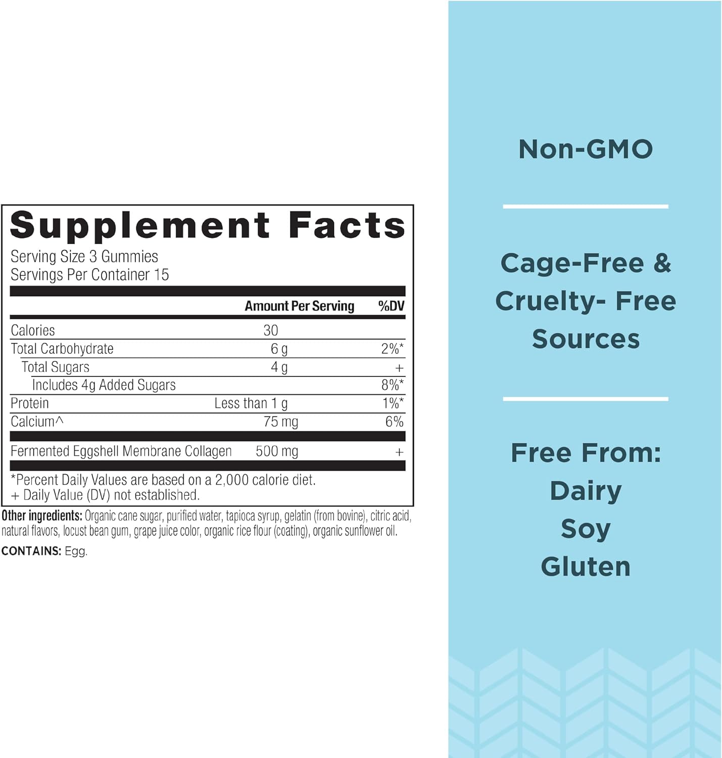 BULLET POINTS : 1 > You will receive (1) bottle of Collagen Peptides Gummies, Mixed Berry, 45 count with 500mg of fermented eggshell membrane collagen per serving (3 gummies)
