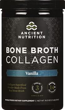 About this item NEW LOOK, SAME GREAT QUALITY - For a limited time, you may receive either packaging. Rest assured it FEATURES OUR BREAKTHROUGH FORMULATION that delivers the benefits of homemade bone broth collagen in a convenient, easy-to-mix powder BURSTING WITH BENEFITS: Ancient Nutrition's Bone Broth Collagen Powder features three types of collagen from three food sources, providing Collagen Type I, II and III from chicken, beef and turkey. Available in decadent chocolate, vanilla, or pure flavor that allows for mixing in your favorite hot or cold beverages. EASY TO USE AND PACKED WITH NUTRIENTS: One serving of Ancient Nutrition Bone Broth Collagen provides 14g of protein and 60 calories in every scoop! Easily and smoothly mix in protein shakes, smoothies, juices and more to boost collagen, gelatin, glucosamine, chondroitin and superfoods often missing in the diet! Try it in coffee or tea! CLEAN & PURE SOURCES โ MADE WITHOUT GROWTH HORMONES OR CHEMICALS, our bone broth collagen powder is derived from chicken and turkey sourced exclusively from Midwest US farms, and grass-fed and pasture-raised cows from South America Our formulas are informed by ancient wisdom and backed by modern science; We use clinically-studied ingredients, backed by research and tested by accredited 3rd party labs for efficacy, GMP Certified for safety and all products are made in the U.S.A.  See more product details,NEW LOOK, SAME GREAT QUALITY - For a limited time, you may receive either packaging. Rest assured it FEATURES OUR BREAKTHROUGH FORMULATION that delivers the benefits of homemade bone broth collagen in a convenient, easy-to-mix powder,BURSTING WITH BENEFITS: Ancient Nutrition's Bone Broth Collagen Powder features three types of collagen from three food sources, providing Collagen Type I, II and III from chicken, beef and turkey. Available in decadent chocolate, vanilla, or pure flavor that allows for mixing in your favorite hot or cold beverages,EASY TO USE AND PACKED WITH NUTRIENTS: One serving of Ancient Nutrition Bone Broth Collagen provides 14g of protein and 60 calories in every scoop! Easily and smoothly mix in protein shakes, smoothies, juices and more to boost collagen, gelatin, glucosamine, chondroitin and superfoods often missing in the diet! Try it in coffee or tea!,CLEAN & PURE SOURCES โ MADE WITHOUT GROWTH HORMONES OR CHEMICALS, our bone broth collagen powder is derived from chicken and turkey sourced exclusively from Midwest US farms, and grass-fed and pasture-raised cows from South America,Our formulas are informed by ancient wisdom and backed by modern science; We use clinically-studied ingredients, backed by research and tested by accredited 3rd party labs for efficacy, GMP Certified for safety and all products are made in the U.S.A