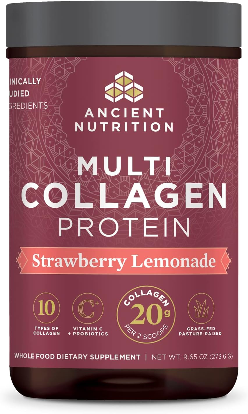Ancient Nutrition Collagen Powder Protein, Multi Collagen Protein Powder, Strawberry Lemonade, 24 Servings, W/Vitamin C, Hydrolyzed Collagen Peptides For Skin, Nails, Gut Health And Joints, 9.65Oz