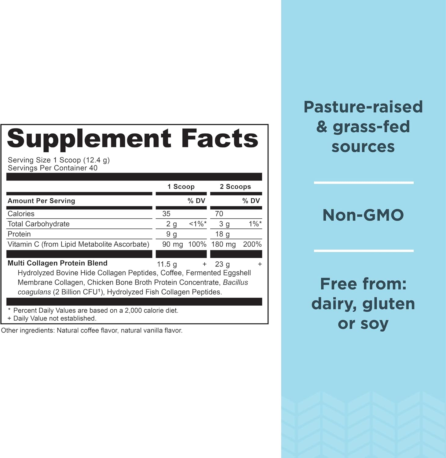 About this item You will receive (1) tub of Multi Collagen Protein Powder Cold Brew, 40 Servings.. BURSTING WITH BENEFITS - Just add a scoop of our cold brew collagen powder to a wide variety of healthy beverages to help promote healthy skin and nails while giving your joints the support they need.. EASY TO USE AND PACKED WITH NUTRIENTS: Multi Collagen Protein Cold Brew offers an energizing coffee flavored drink with 9g of protein, 42 mg of caffeine (per serving) and 40 calories in every serving. Add a scoop to any smoothie, protein shake, tea, coffee or your favorite drink for a daily boost of collagen protein and gut support.. CLEAN & PURE SOURCES – Made without antibiotics, growth hormones and chemicals, our collagen protein powder is derived from chicken and eggs sourced exclusively from Midwest US farms, grass fed and pasture-raised cows from South America and shellfish-free fish collagen derived from wild, cold water fish sustainably harvested in North America.. Our formulas are informed by ancient wisdom and backed by modern science; We use clinically-studied ingredients, backed by research and tested by accredited 3rd party labs for efficacy, GMP Certified for safety and all products are made in the U.S.A.. See more product details,You will receive (1) tub of Multi Collagen Protein Powder Cold Brew, 40 Servings,BURSTING WITH BENEFITS - Just add a scoop of our cold brew collagen powder to a wide variety of healthy beverages to help promote healthy skin and nails while giving your joints the support they need,EASY TO USE AND PACKED WITH NUTRIENTS: Multi Collagen Protein Cold Brew offers an energizing coffee flavored drink with 9g of protein, 42 mg of caffeine (per serving) and 40 calories in every serving. Add a scoop to any smoothie, protein shake, tea, coffee or your favorite drink for a daily boost of collagen protein and gut support,CLEAN & PURE SOURCES – Made without antibiotics, growth hormones and chemicals, our collagen protein powder is derived from chicken and eggs sourced exclusively from Midwest US farms, grass fed and pasture-raised cows from South America and shellfish-free fish collagen derived from wild, cold water fish sustainably harvested in North America,Our formulas are informed by ancient wisdom and backed by modern science; We use clinically-studied ingredients, backed by research and tested by accredited 3rd party labs for efficacy, GMP Certified for safety and all products are made in the U.S.A