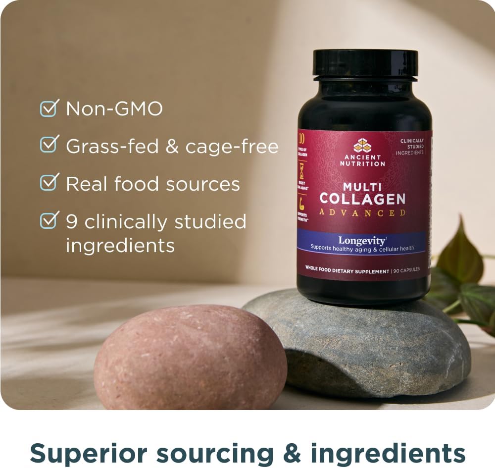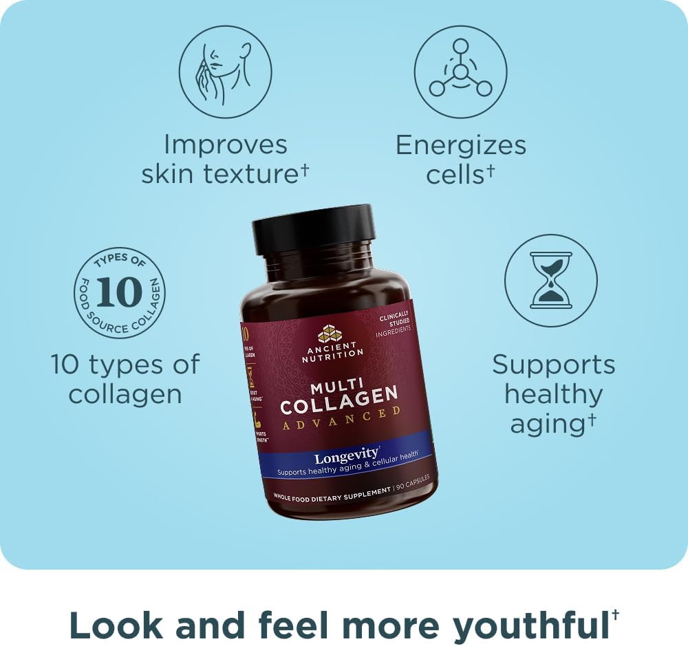 About this item Supports Healthy Aging: Multi Collagen Advanced Longevity combines 10 types of collagen with clinically studied superfoods to support skin elasticity, joint comfort, and cellular energy, helping you feel youthful and vibrant. Visible Skin Benefits: Experience visibly improved skin texture and reduced appearance of wrinkles for a smoother, more radiant complexion with this unique collagen blend. Enhanced Joint Comfort & Flexibility: Formulated to support joint flexibility and reduce discomfort, keeping you moving comfortably and feeling revitalized as you age. Backed by Clinical Research: Powered by ingredients supported by both ancient tradition and modern science, this blend delivers results backed by clinical studies, including improved body composition and cellular health*. Convenient and Effective: Take 3 capsules daily for a boost in skin radiance, joint health, and energy, making it easy to integrate youthful vitality into your routine. See more product details,Supports Healthy Aging: Multi Collagen Advanced Longevity combines 10 types of collagen with clinically studied superfoods to support skin elasticity, joint comfort, and cellular energy, helping you feel youthful and vibrant,Visible Skin Benefits: Experience visibly improved skin texture and reduced appearance of wrinkles for a smoother, more radiant complexion with this unique collagen blend,Enhanced Joint Comfort & Flexibility: Formulated to support joint flexibility and reduce discomfort, keeping you moving comfortably and feeling revitalized as you age,Backed by Clinical Research: Powered by ingredients supported by both ancient tradition and modern science, this blend delivers results backed by clinical studies, including improved body composition and cellular health,Convenient and Effective: Take 3 capsules daily for a boost in skin radiance, joint health, and energy, making it easy to integrate youthful vitality into your routine