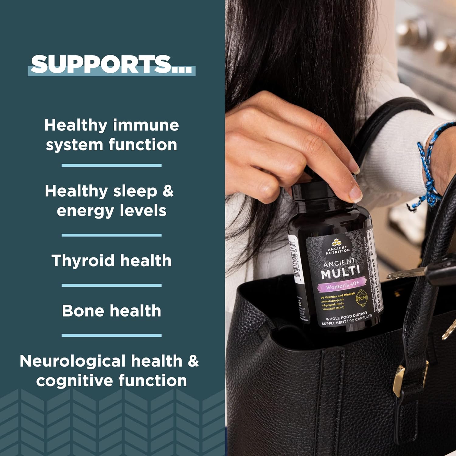 About this item VITAMINS- This supplement contains 20 vitamins and minerals specially formulated for women over 40. Vitamin D helps support bone and immune system health, which is especially important for women over 40. TCM WOMENâS 40+ BLEND- Our Traditional Chinese Method blend is based off of a Chinese tradition using herbs that has been around for more than 2,000 years.This blend features Fo-Ti and Organic Chaste Tree Berry. We also added Bovine liver and Wild Hake Roe, which are considered some of the most nutrient-dense foods on this planet, as well as collagen-rich bone broth and Organic Dong Quai Root. CONVENIENCE- Take 3 capsules once per day with 8 oz. of water. Can be taken with or without food, any time of day. Great for women 40 and older who want to focus on bone health, cardiovascular health, and healthy energy levels. QUALITY- At Ancient Nutrition, we only use the highest-quality ingredients for our products to support your overall health and immune system health. This formula is made from real food nutrients without any binders, fillers, artificial colors, sweeteners or additives. Our formulas are informed by ancient wisdom and backed by modern science; We use clinically-studied ingredients, backed by research and tested by accredited 3rd party labs for efficacy, GMP Certified for safety and all products are made in the U.S.A. See more product details,VITAMINS- This supplement contains 20 vitamins and minerals specially formulated for women over 40. Vitamin D helps support bone and immune system health, which is especially important for women over 40,TCM WOMENâS 40+ BLEND- Our Traditional Chinese Method blend is based off of a Chinese tradition using herbs that has been around for more than 2,000 years.This blend features Fo-Ti and Organic Chaste Tree Berry. We also added Bovine liver and Wild Hake Roe, which are considered some of the most nutrient-dense foods on this planet, as well as collagen-rich bone broth and Organic Dong Quai Root,CONVENIENCE- Take 3 capsules once per day with 8 oz. of water. Can be taken with or without food, any time of day. Great for women 40 and older who want to focus on bone health, cardiovascular health, and healthy energy levels,QUALITY- At Ancient Nutrition, we only use the highest-quality ingredients for our products to support your overall health and immune system health. This formula is made from real food nutrients without any binders, fillers, artificial colors, sweeteners or additives,Our formulas are informed by ancient wisdom and backed by modern science; We use clinically-studied ingredients, backed by research and tested by accredited 3rd party labs for efficacy, GMP Certified for safety and all products are made in the U.S.A