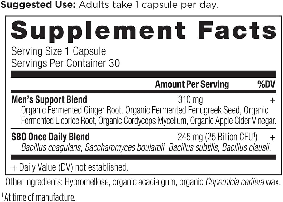 About this item You will receive (1) bottle of Probiotics for Men, Once Daily 30 Count. FORMULATED FOR MEN β Ancient Nutrition's SBO Probiotics for men brings together a combination of soil-based probiotic strains and an organic fermented blend of superfoods formulated specifically to help support men's health. 25 BILLION CFU β Unique blend of shelf-stable probiotics including Saccharomyces boulardii, Bacillus subtilis, Bacillus coagulans, and Bacillus clausii are brought together to provide 25 Billion CFU* of soil-based probiotics (*at time of manufacture). ONCE DAILY DIGESTIVE & IMMUNE SYSTEM SUPPORT β 1 capsule daily provides support for healthy digestion and immune system support, and provides a convenient way to support your body with powerful & effective probiotics. Our formulas are informed by ancient wisdom and backed by modern science; We use clinically-studied ingredients, backed by research and tested by accredited 3rd party labs for efficacy, GMP Certified for safety and all products are made in the U.S.A. See more product details,You will receive (1) bottle of Probiotics for Men, Once Daily 30 Count,FORMULATED FOR MEN β Ancient Nutrition's SBO Probiotics for men brings together a combination of soil-based probiotic strains and an organic fermented blend of superfoods formulated specifically to help support men's health,25 BILLION CFU β Unique blend of shelf-stable probiotics including Saccharomyces boulardii, Bacillus subtilis, Bacillus coagulans, and Bacillus clausii are brought together to provide 25 Billion CFU* of soil-based probiotics (*at time of manufacture),ONCE DAILY DIGESTIVE & IMMUNE SYSTEM SUPPORT β 1 capsule daily provides support for healthy digestion and immune system support, and provides a convenient way to support your body with powerful & effective probiotics,Our formulas are informed by ancient wisdom and backed by modern science; We use clinically-studied ingredients, backed by research and tested by accredited 3rd party labs for efficacy, GMP Certified for safety and all products are made in the U.S.A