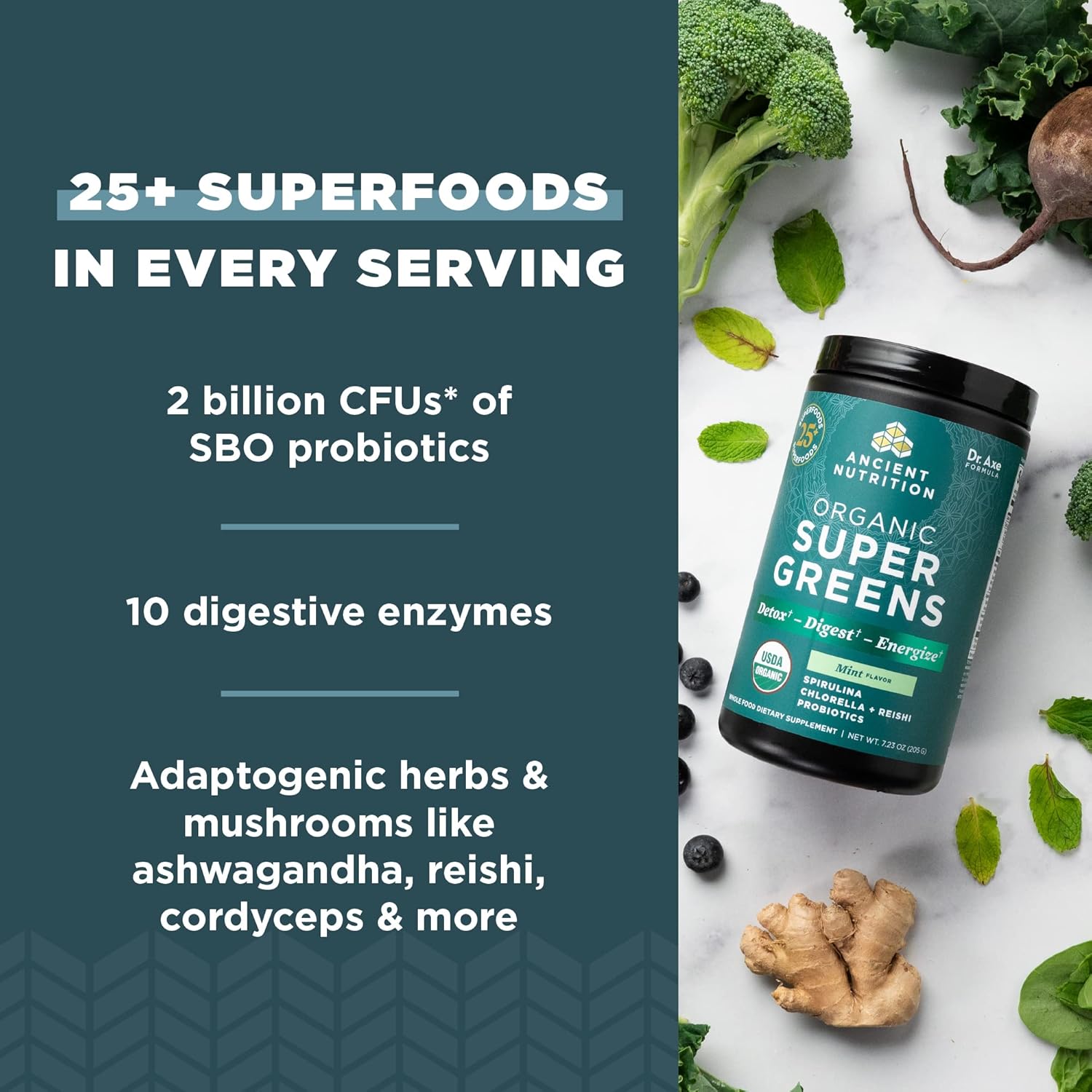 About this item Ancient Nutrition Organic Supergreens and Multivitamin Powder With Probiotics, Made from Real Fruits, Vegetables and Herbs, for Digestive, Detoxification and Energy Support, 25 Servings You will receive (1) tub of Organic SuperGreens + Organic Multivitamin Powder, 25 servings with 1 gram of sugar per serving and 0 grams added sugar.. SUPERFOOD FORMULATION: Supports healthy digestive function, detoxification, healthy energy, reduces occasional gas & bloating, and helps maintain healthy gut microflora. This mixable powder formula is the first ever certified organic greens + certified organic vitamins and minerals in one. It rolls two supplements (a multi and a greens product) into one so you can get the essential vitamins and minerals your body craves, and digest, detox and energize in one simple scoop.. GREAT TASTING: Get the benefits of juicing every day without the hassle. This greens powder is packed with 25+ greens plus you’ll get 22 vitamins and minerals to help fill in the nutrient gaps in your diet. This formula makes it easy to get your greens and the essential vitamins and minerals your body craves.. SIMPLE AND EASY TO USE: Add one scoop to water, juice or your favorite smoothie recipe to easily up your daily greens.. Our formulas are informed by ancient wisdom and backed by modern science; We use clinically-studied ingredients, backed by research and tested by accredited 3rd party labs for efficacy, GMP Certified for safety and all products are made in the U.S.A.. See more product details,Ancient Nutrition Organic Supergreens and Multivitamin Powder With Probiotics, Made from Real Fruits, Vegetables and Herbs, for Digestive, Detoxification and Energy Support, 25 Servings,You will receive (1) tub of Organic SuperGreens + Organic Multivitamin Powder, 25 servings with 1 gram of sugar per serving and 0 grams added sugar,SUPERFOOD FORMULATION: Supports healthy digestive function, detoxification, healthy energy, reduces occasional gas & bloating, and helps maintain healthy gut microflora. This mixable powder formula is the first ever certified organic greens + certified organic vitamins and minerals in one. It rolls two supplements (a multi and a greens product) into one so you can get the essential vitamins and minerals your body craves, and digest, detox and energize in one simple scoop,GREAT TASTING: Get the benefits of juicing every day without the hassle. This greens powder is packed with 25+ greens plus you’ll get 22 vitamins and minerals to help fill in the nutrient gaps in your diet. This formula makes it easy to get your greens and the essential vitamins and minerals your body craves,SIMPLE AND EASY TO USE: Add one scoop to water, juice or your favorite smoothie recipe to easily up your daily greens,Our formulas are informed by ancient wisdom and backed by modern science; We use clinically-studied ingredients, backed by research and tested by accredited 3rd party labs for efficacy, GMP Certified for safety and all products are made in the U.S.A