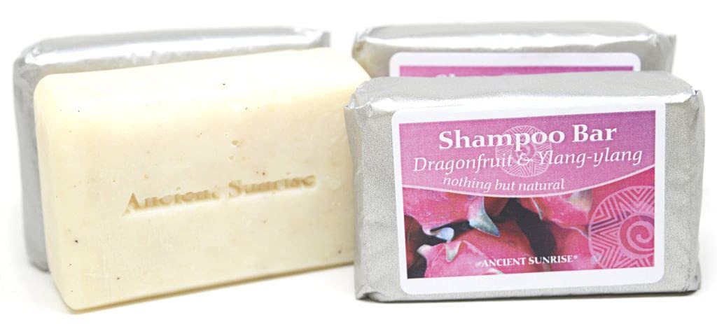 Ancient Sunrise shampoo bars contain no artificial fragrances and use no plastic packaging. They're long-lasting, rinse clean and they're perfect for travel, camping or to stash in your gym bag. Ancient Sunrise Dragon Fruit and Ylang-ylang Shampoo Bar is infused with Dragon Fruit powder high in vitamins A, B and C adding shine and strength along with ylang-ylang essential oil for an exotic scent, this will quickly become a favorite. Ingredients include dragon fruit powder, therapeutic grade ylang ylang essential oil. Shampoo base contains: distilled water, saponified coconut oil, rice bran oil, sunflower oil, hemp seed oil and castor bean oil