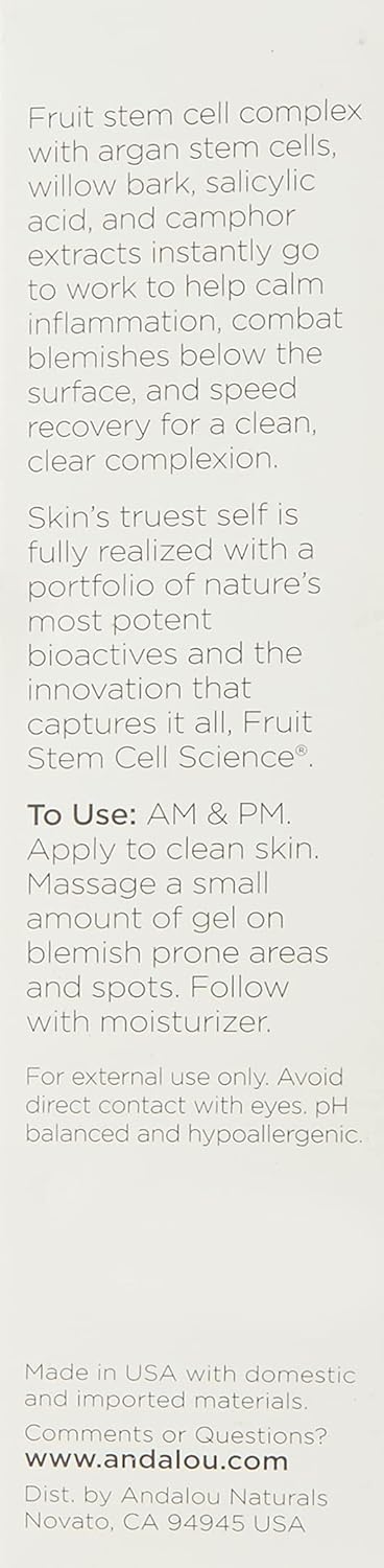 About this item Blemish Gel: This maximum strength gel helps calm irritation associated with acne and breakouts; Andalou Natural's Vanishing Gel helps support healthy dermal regeneration for a clean, clear complexion Inspired By Nature: Fruit stem cell complex with argan stem cells, willow bark, salicylic acid and camphor extracts instantly go to work to help calm inflammation and combat blemishes below the surface Ingredients From Nature: Andalou Naturals products are 98% nature-derived and vegetarian with a large vegan offering; Plus, we're gluten-free and cruelty-freeāwe never test on animals Fruit Stem Cell Science: A blend of natureās most potent bioactive stem cells from the Heirloom Apple, Grape, Swiss Alpine Rose, Argan Tree and Hemp Plant support skin protection, restoration and radiance Ultimate Skincare: We believe you should never have to compromise ethics in favor of efficacy; Indulge in our range of toners, cleansers, lotions, masks, wrinkle creams, shampoos and deodorants See more product details,Blemish Gel: This maximum strength gel helps calm irritation associated with acne and breakouts; Andalou Natural's Vanishing Gel helps support healthy dermal regeneration for a clean, clear complexion,Inspired By Nature: Fruit stem cell complex with argan stem cells, willow bark, salicylic acid and camphor extracts instantly go to work to help calm inflammation and combat blemishes below the surface,Ingredients From Nature: Andalou Naturals products are 98% nature-derived and vegetarian with a large vegan offering; Plus, we're gluten-free and cruelty-freeāwe never test on animals,Fruit Stem Cell Science: A blend of natureās most potent bioactive stem cells from the Heirloom Apple, Grape, Swiss Alpine Rose, Argan Tree and Hemp Plant support skin protection, restoration and radiance,Ultimate Skincare: We believe you should never have to compromise ethics in favor of efficacy; Indulge in our range of toners, cleansers, lotions, masks, wrinkle creams, shampoos and deodorants